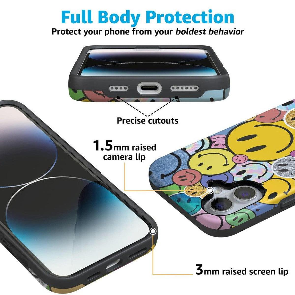 Want a retro look for your phone? Nail that 90s nostalgia aesthetic with this fun, playful phone case. With an eye-catching design in bright and cheerful colors, these smileys will bring a smile to your own face every time you take out your phone.