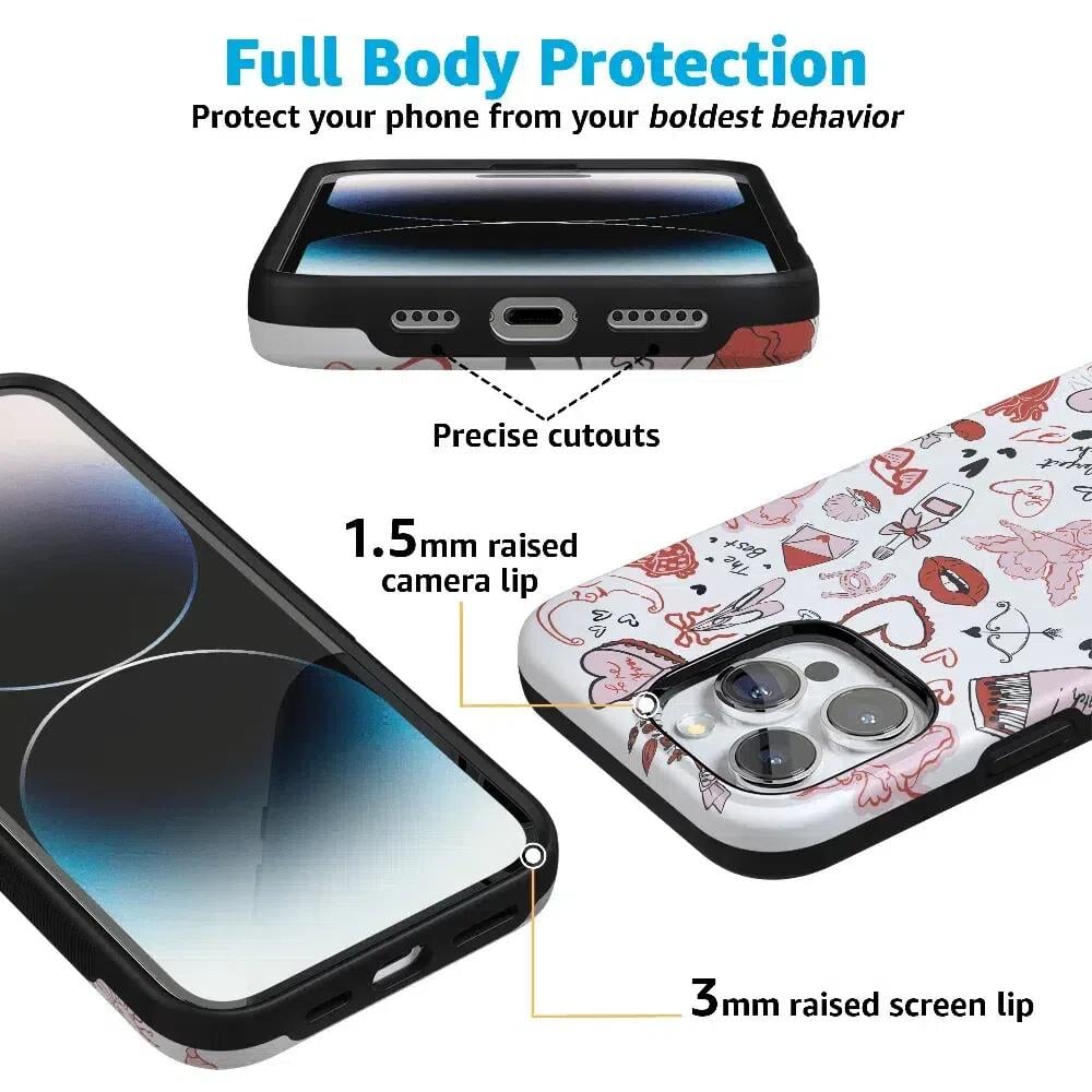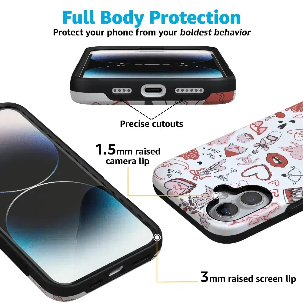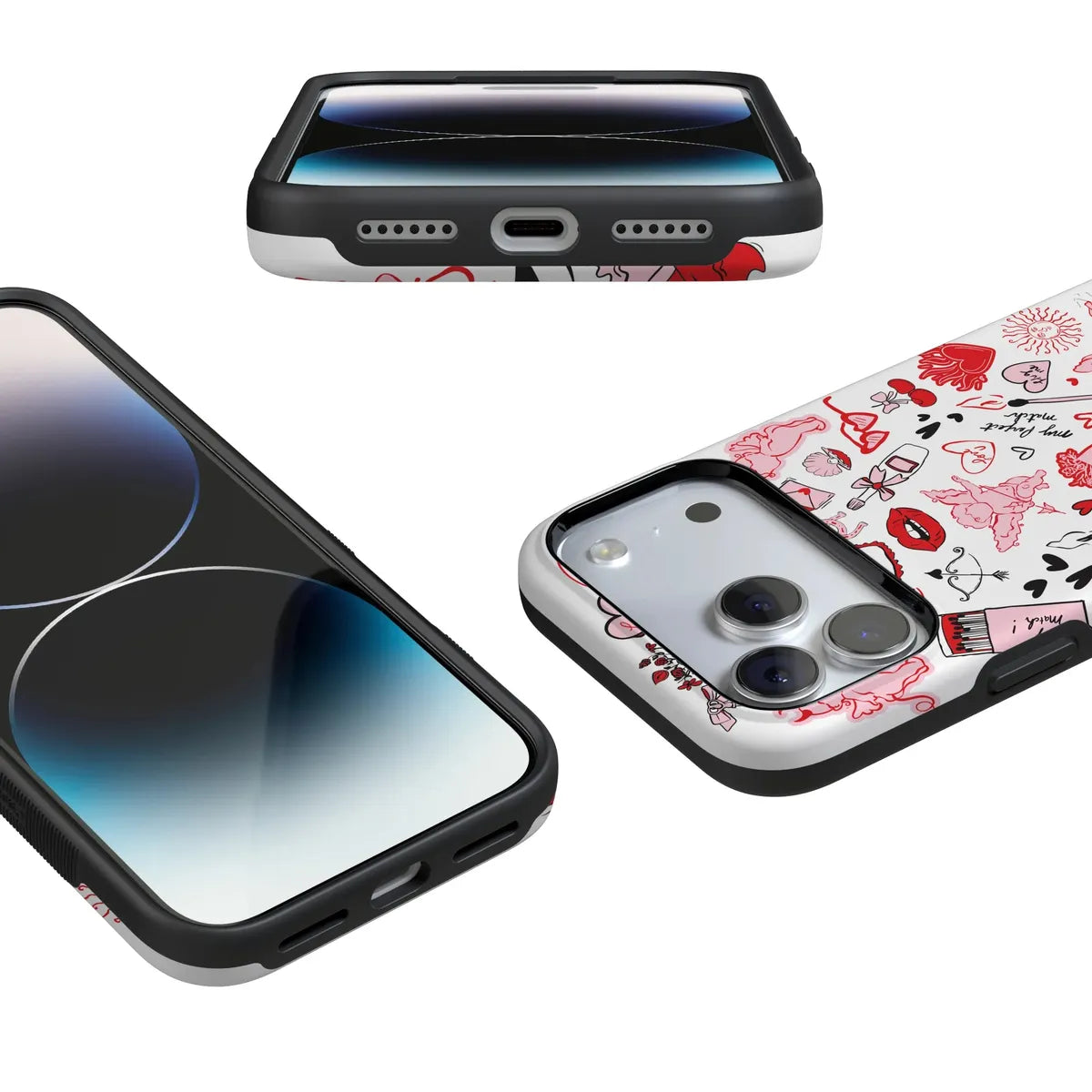 Fall in love with the Cupid's Touch | Collage Case, a must-have for Valentine’s Day. Featuring a playful mix of love-inspired doodles—cherubs, roses, hearts, lips, and sweet phrases—this design radiates charm and romance. The vibrant red, pink, and black accents on a crisp white background make it the perfect accessory for adding a touch of love to your everyday style.