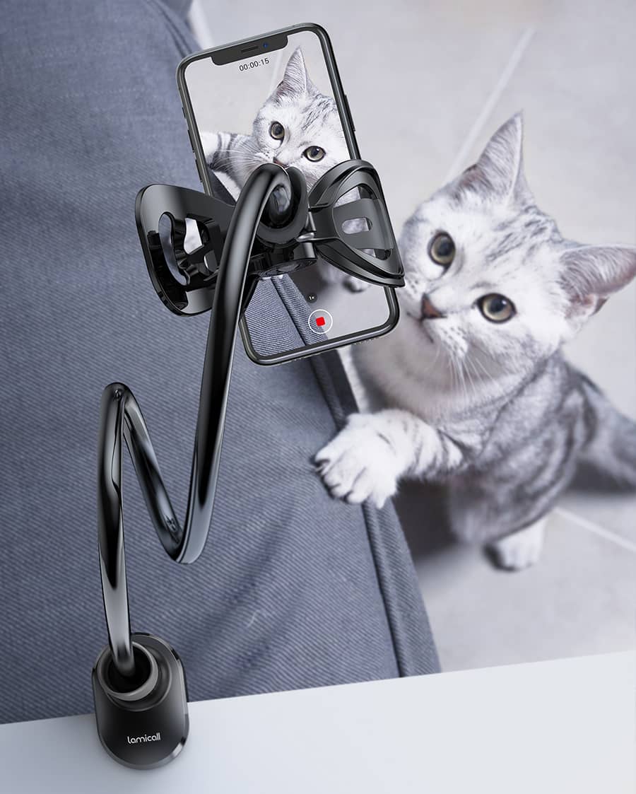 Lamicall Phone Holder Bed Gooseneck Mount - Cell Phone Clamp Clip for Desk, Flexible Lazy Long Arm Headboard Bedside, Overhead Mount Stand, Compatible with iPhone 14 Plus/Pro Max XR X 8 7 6 Plus - LS05 is made of improved materials, providing better stability and durability while maintaining a certain level of flexibility. This phone holder is versatile, allowing you to watch Netflix, use FaceTime, read recipes, and even record videos hands-free. It can be easily installed on various surfaces like bed frames, desks, and kitchen counters with its adjustable clamp base. The non-slip silicone base ensures that your furniture remains scratch-free. The 33.4-inch bendable arm is made of high-quality aluminum-magnesium alloy, providing a sturdy and flexible support for your phone. It is compatible with smartphones ranging from 4 to 7 inches. Using this gooseneck mount can help alleviate neck pain and provide a convenient hands-free experience.