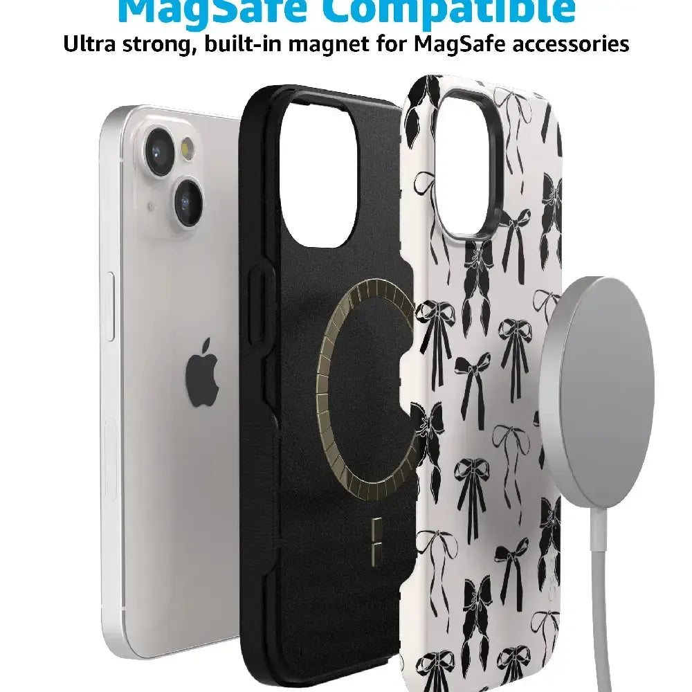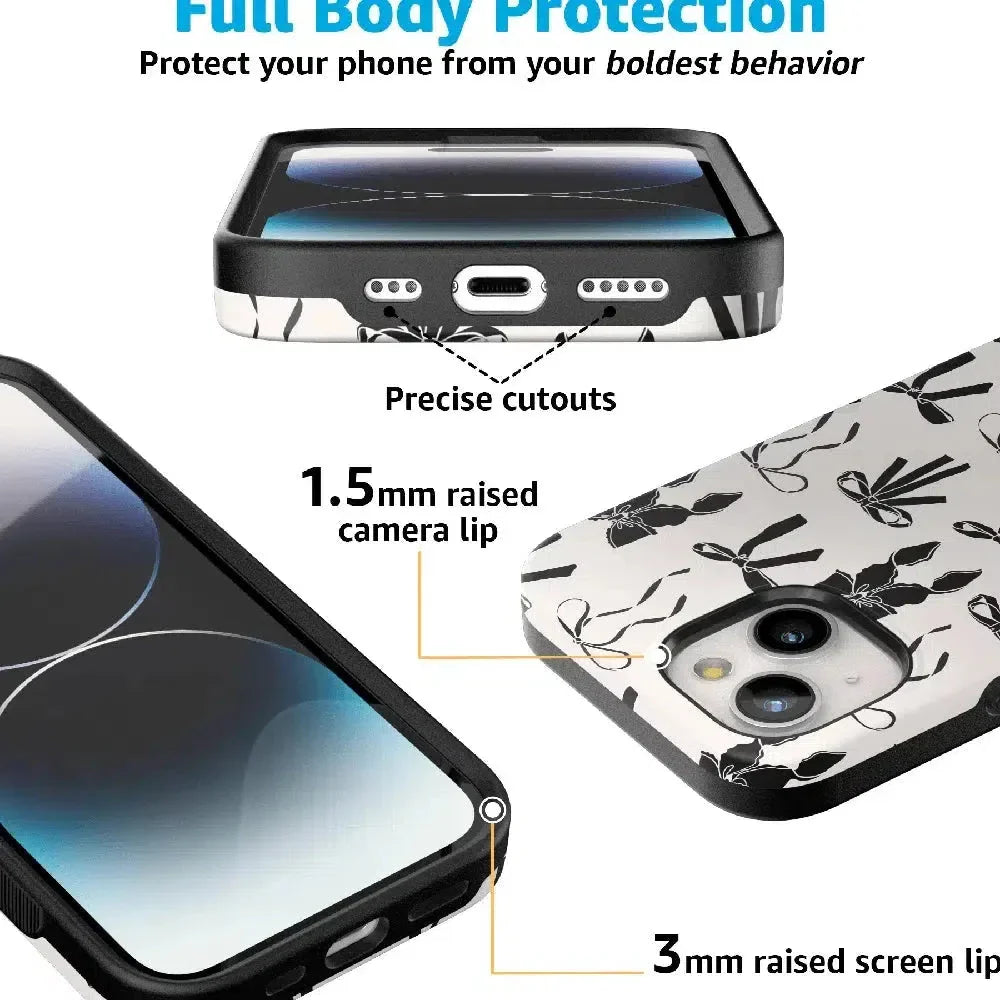 Meet the Goth Girlie Black Bows Case, the latest version of our best-selling Coquette Girlie Case. This new design adds a darker, edgier twist to the beloved style, perfect for those who love to mix cute with a bit of goth flair. Just like the original, it offers dual-layer protection to keep your phone safe from drops and bumps while maintaining a sleek profile. Elevate your style with this must-have case, combining classic bows with a bold, black aesthetic.