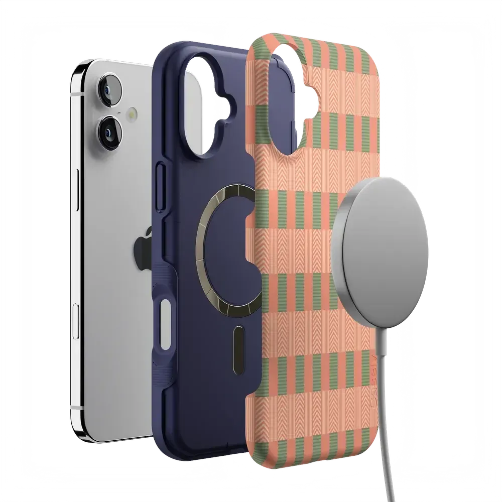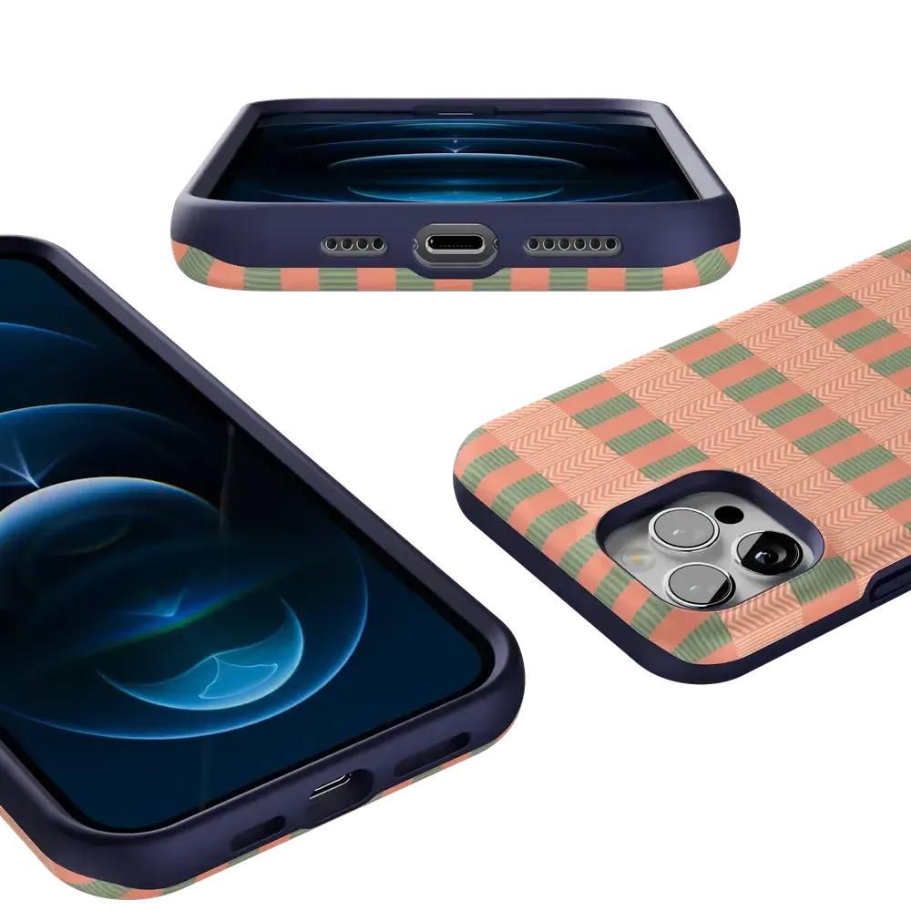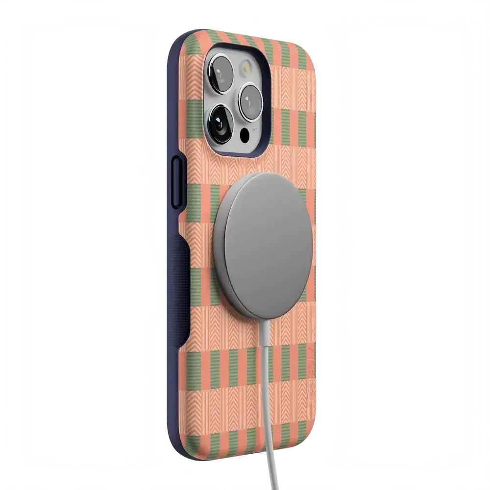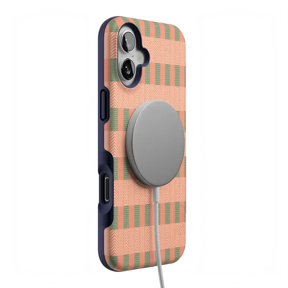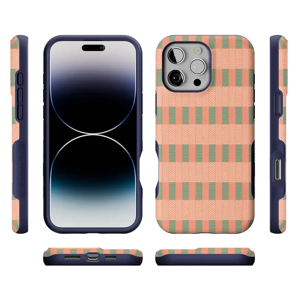 Meet your new poolside essential: the Grand Cabana Case. This bold yet breezy design features alternating peach and olive stripes with subtle chevron detailing that feels right at home at a chic beach club. The color palette is warm, sun-faded, and sophisticated—like a perfectly broken-in cabana towel or your favorite vacation tote.