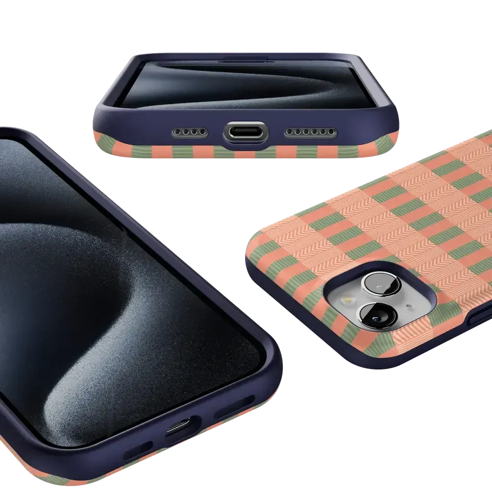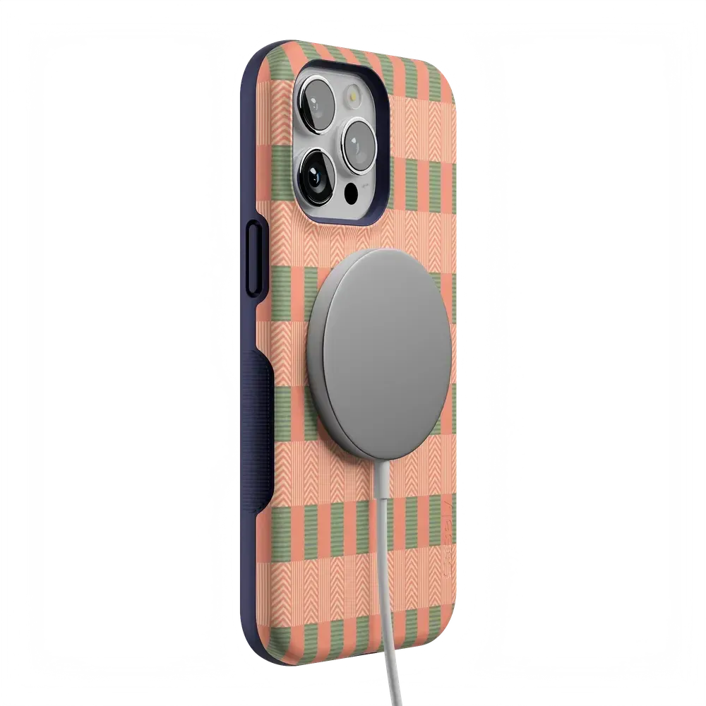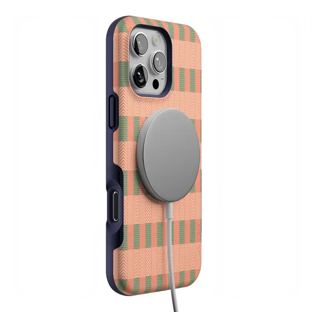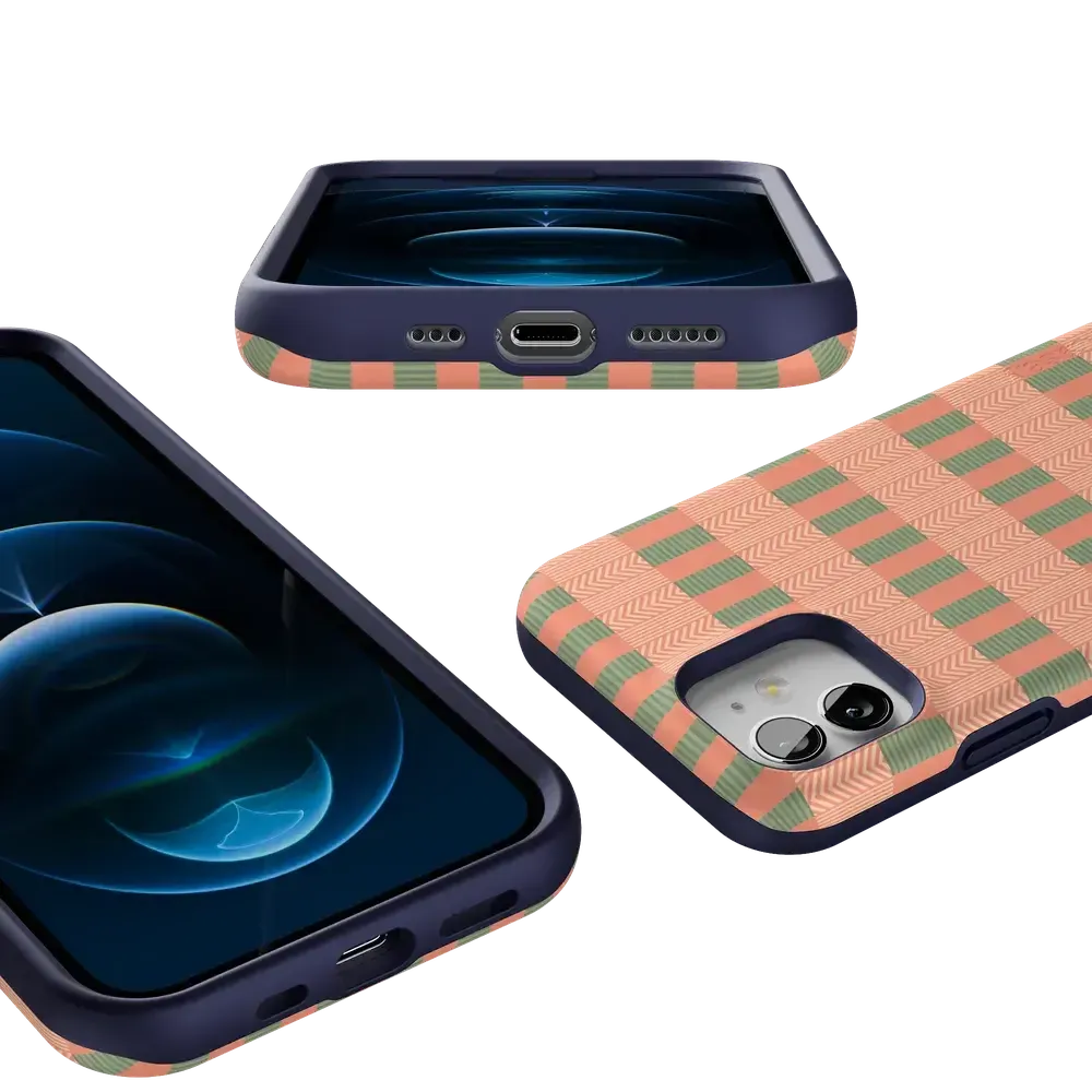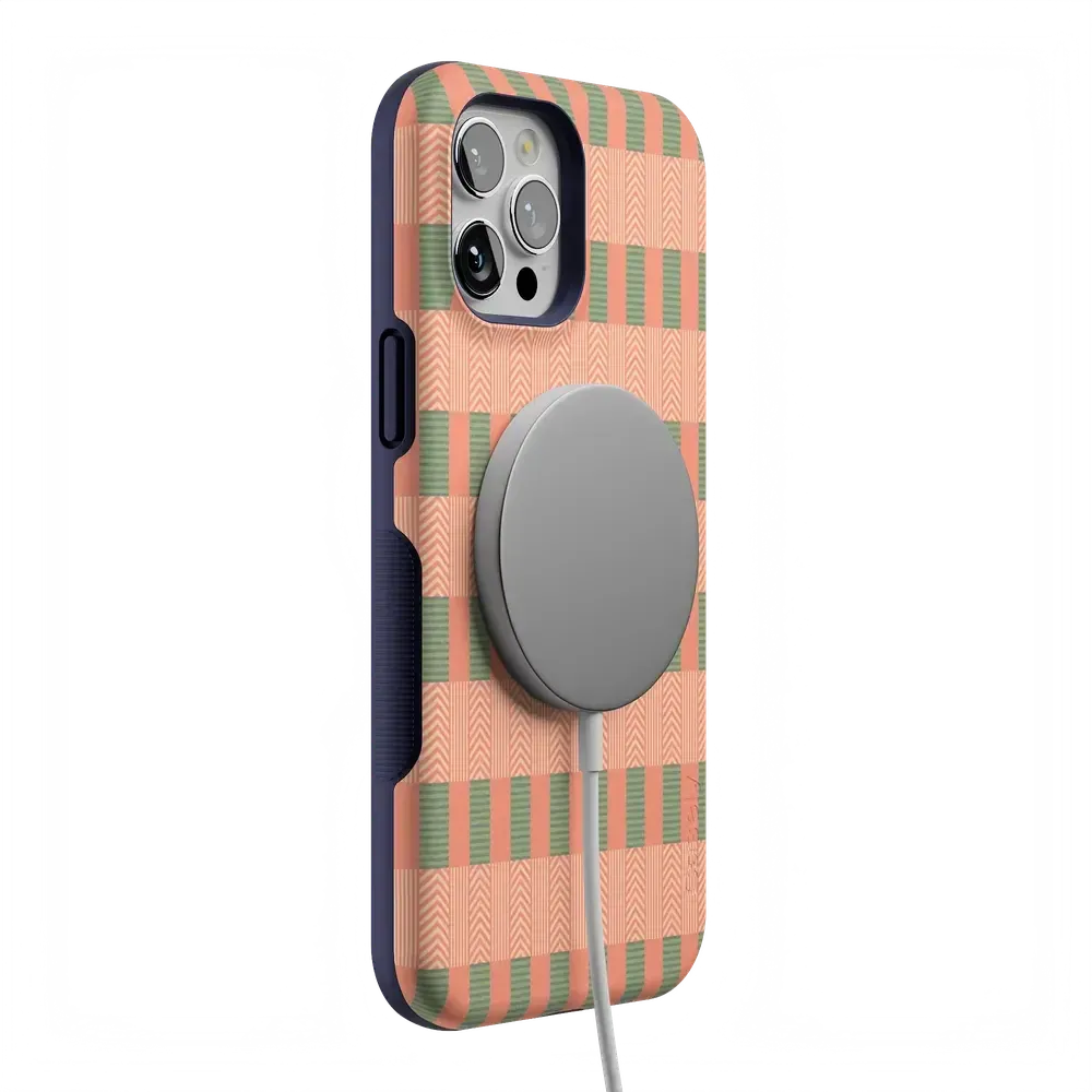 Meet your new poolside essential: the Grand Cabana Case. This bold yet breezy design features alternating peach and olive stripes with subtle chevron detailing that feels right at home at a chic beach club. The color palette is warm, sun-faded, and sophisticated—like a perfectly broken-in cabana towel or your favorite vacation tote.