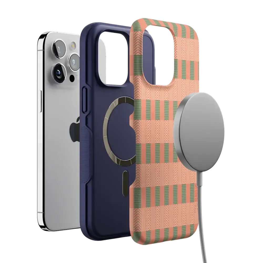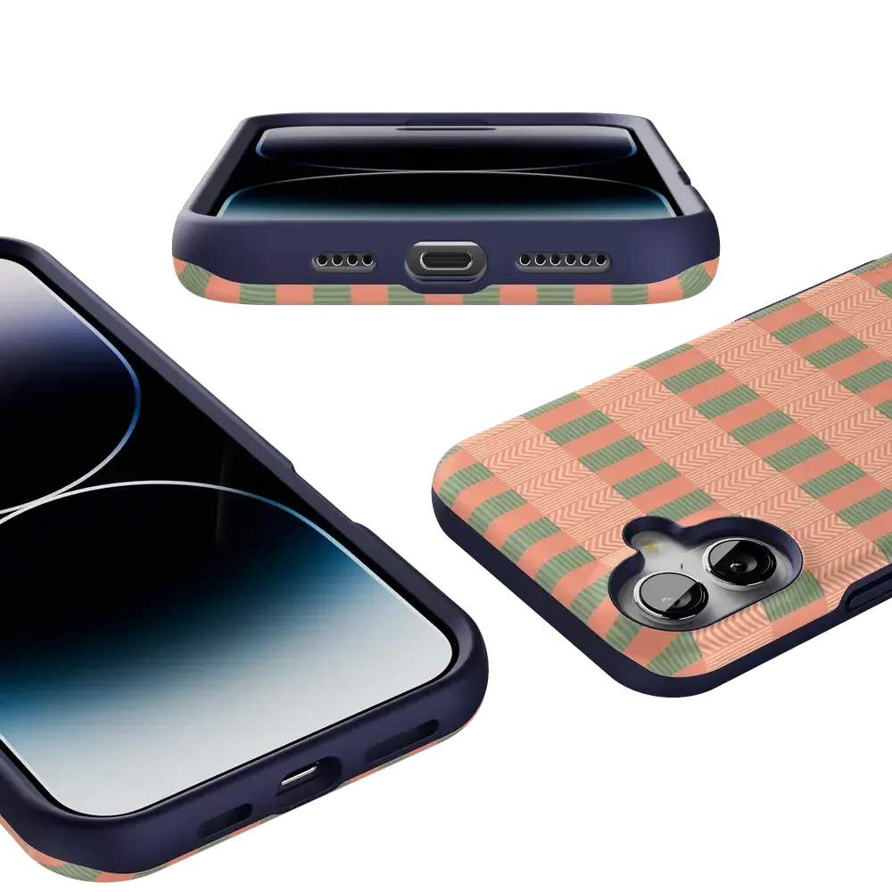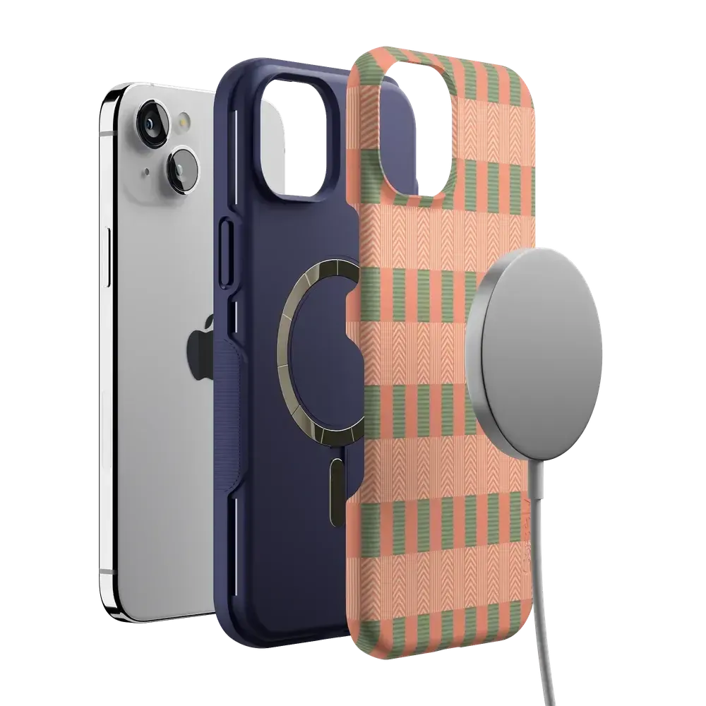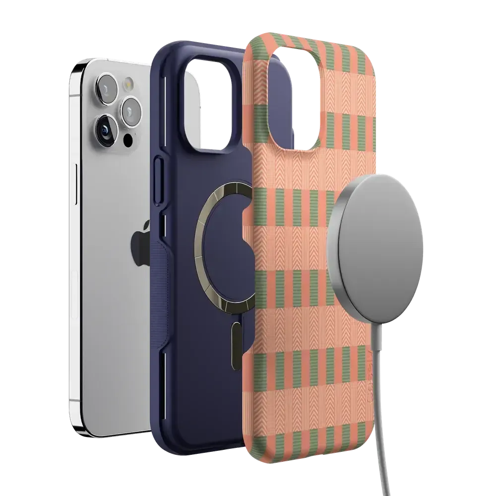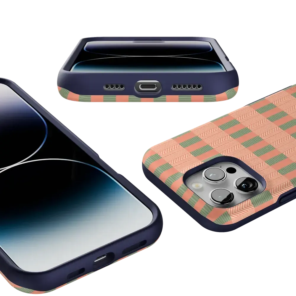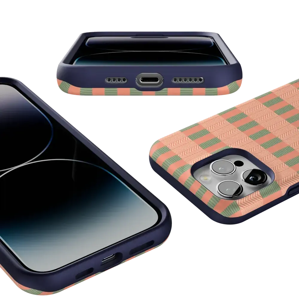Meet your new poolside essential: the Grand Cabana Case. This bold yet breezy design features alternating peach and olive stripes with subtle chevron detailing that feels right at home at a chic beach club. The color palette is warm, sun-faded, and sophisticated—like a perfectly broken-in cabana towel or your favorite vacation tote.