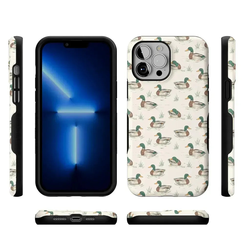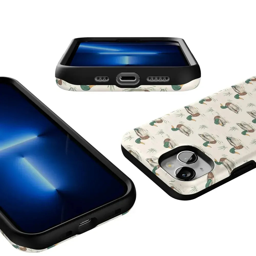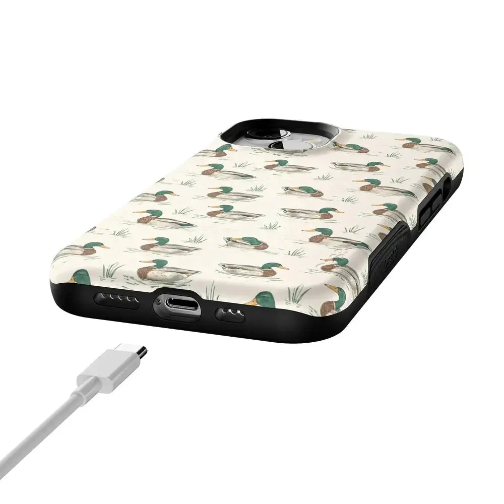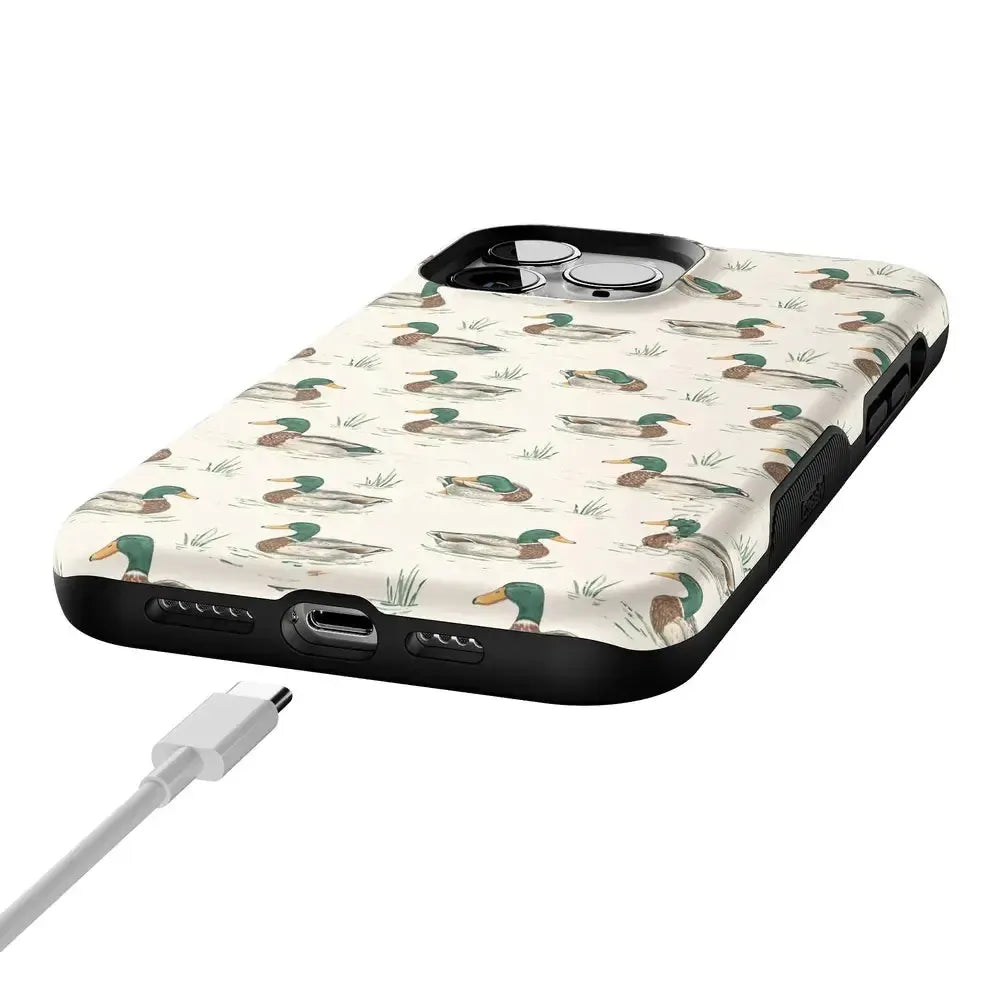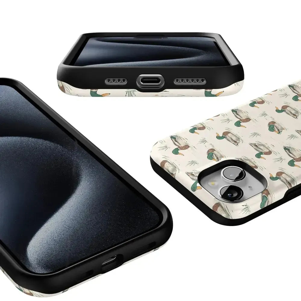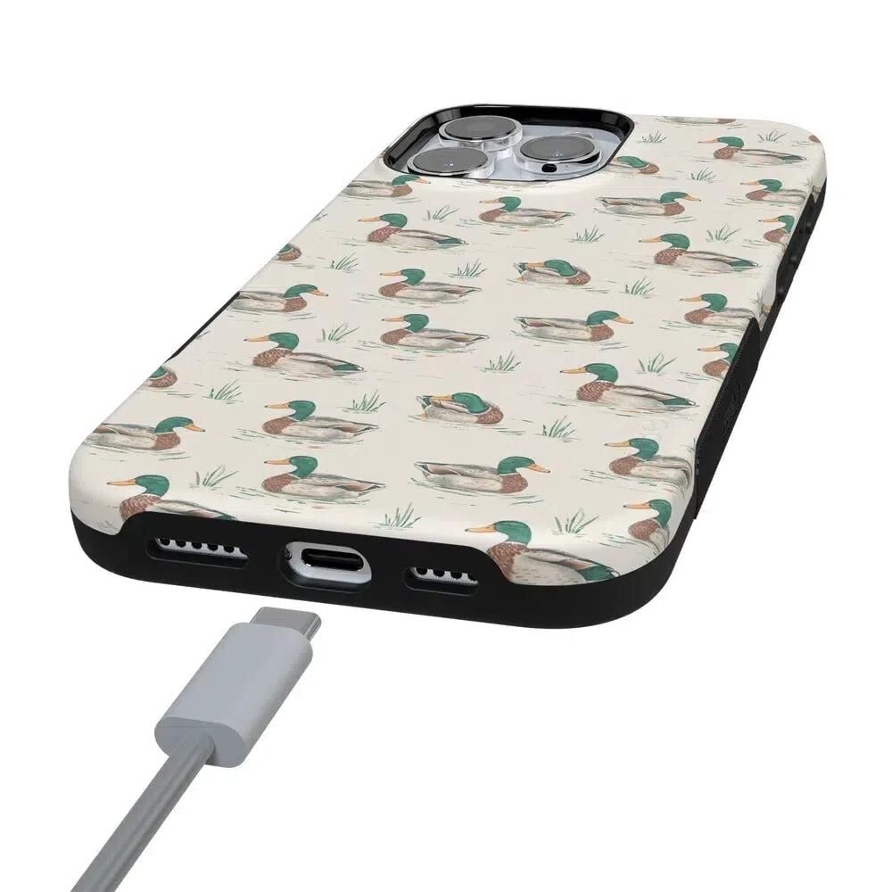 Bring a bit of countryside charm to your everyday carry with the Mallard & Co. phone case from our all-new Boyfriend Collection. Inspired by vintage sporting prints and laid-back cabin weekends, this case blends classic Americana with modern protection. A repeating mallard duck motif floats across a soft beige background, giving it that effortlessly cool, “borrowed-from-him-but-better” vibe.