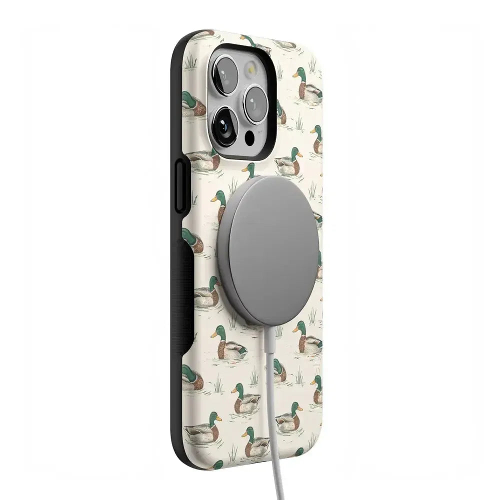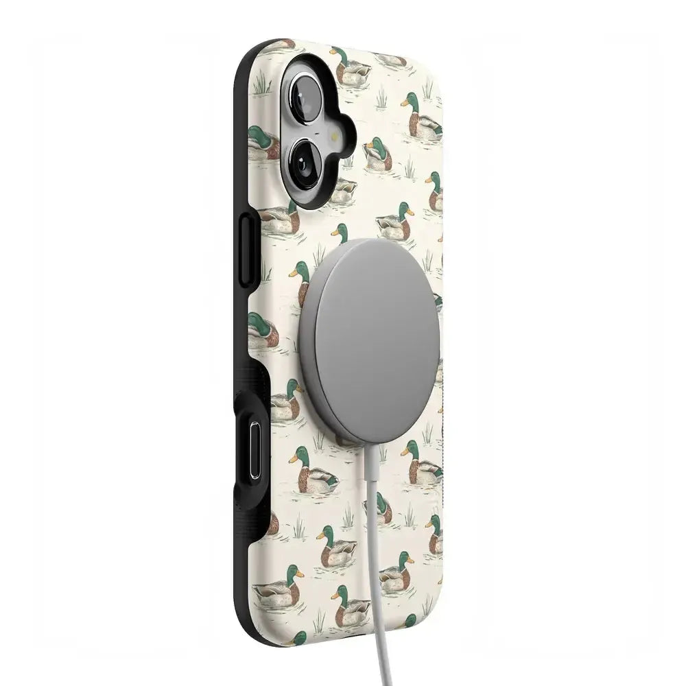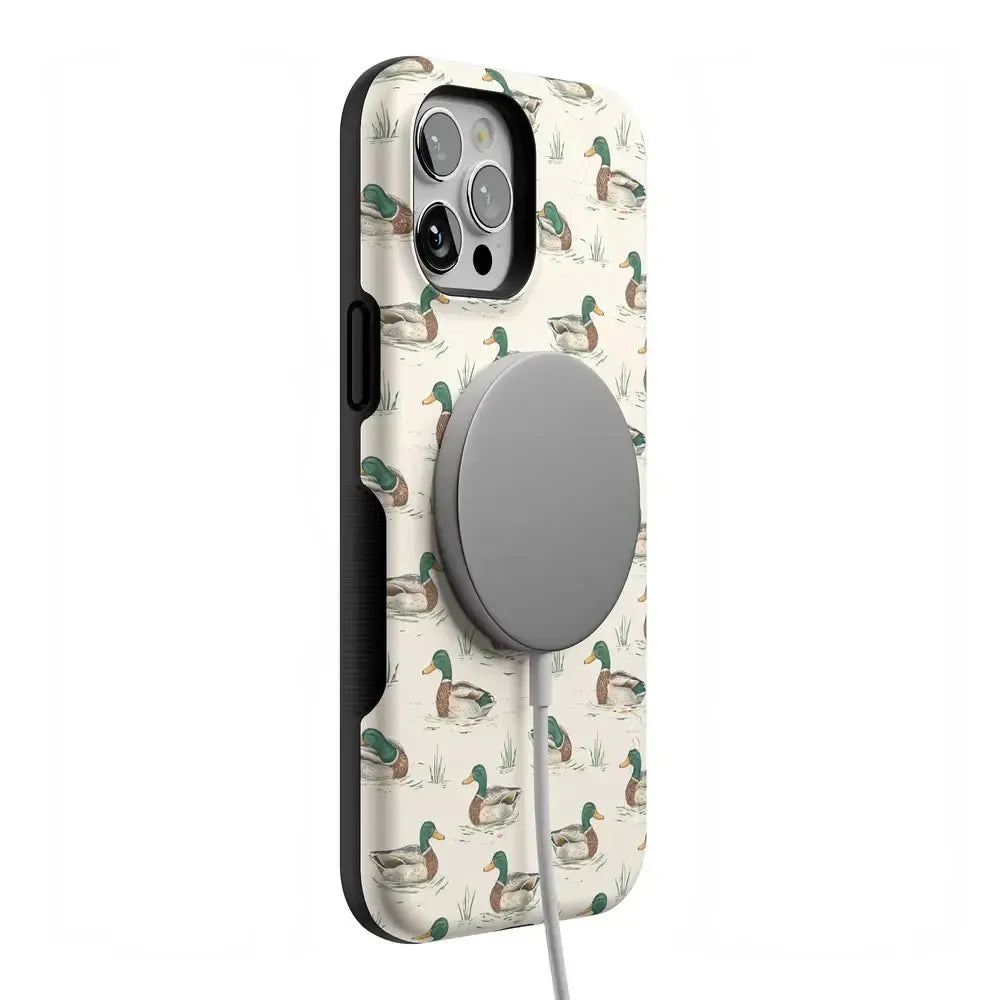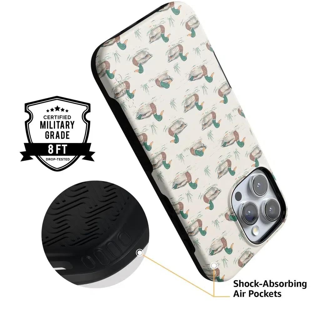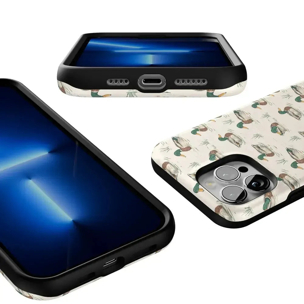 Bring a bit of countryside charm to your everyday carry with the Mallard & Co. phone case from our all-new Boyfriend Collection. Inspired by vintage sporting prints and laid-back cabin weekends, this case blends classic Americana with modern protection. A repeating mallard duck motif floats across a soft beige background, giving it that effortlessly cool, “borrowed-from-him-but-better” vibe.