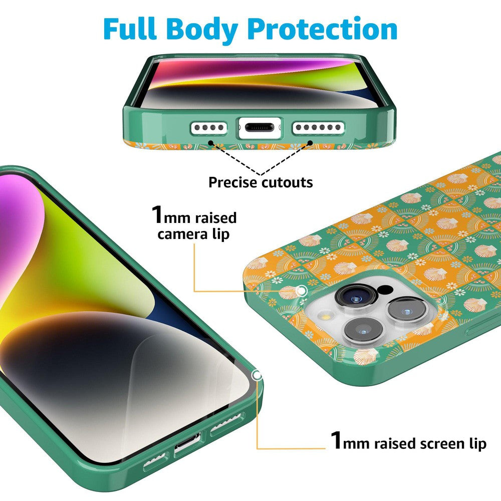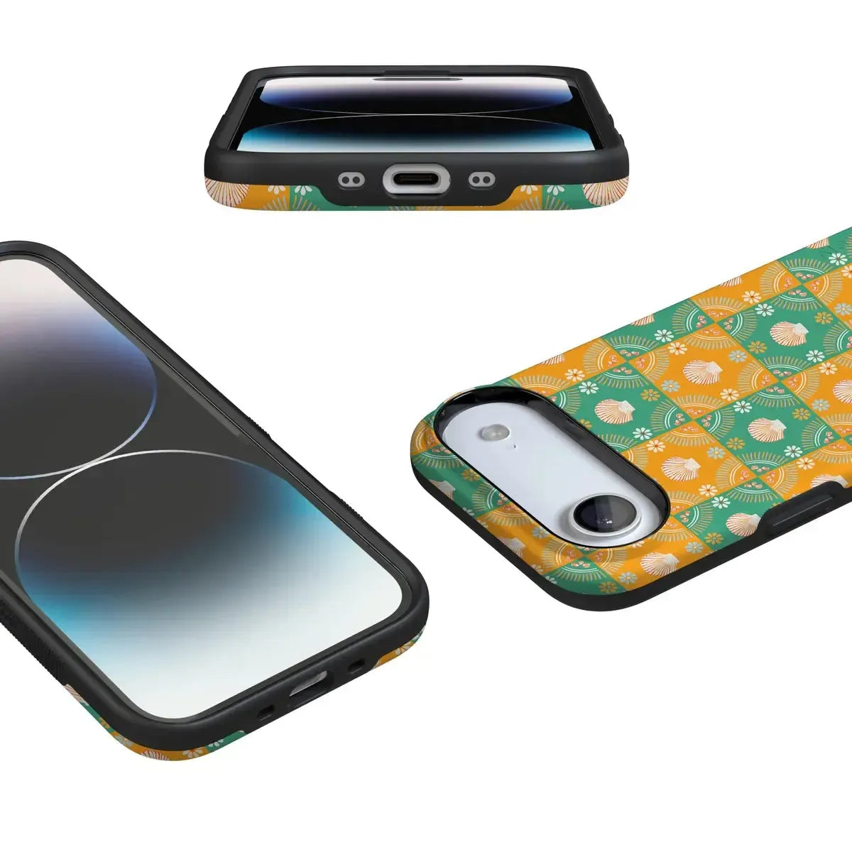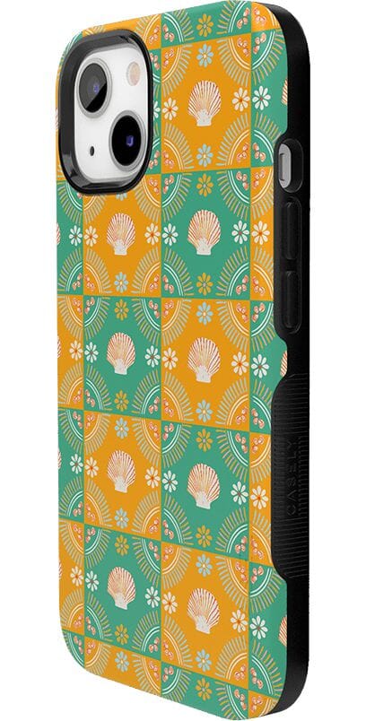 Dive into the serene beauty of coastal life with the Sea La Vie case, part of the exclusive collaboration between Casely and Dippin' Daisy's Tropical Vacation collection. This elegant phone case features a captivating pattern of delicate seashells and floral motifs set against alternating teal and golden backgrounds, reminiscent of sunlit beach tiles.