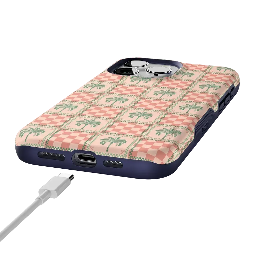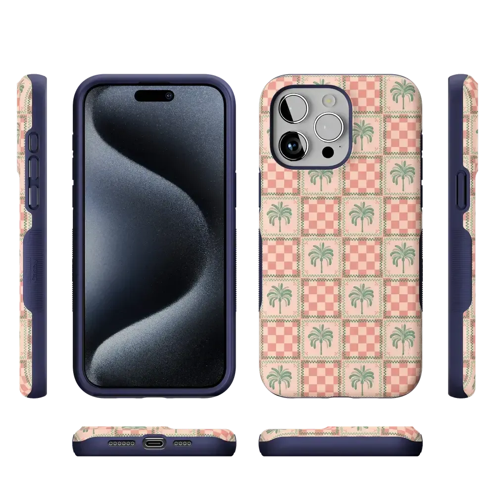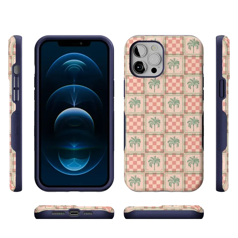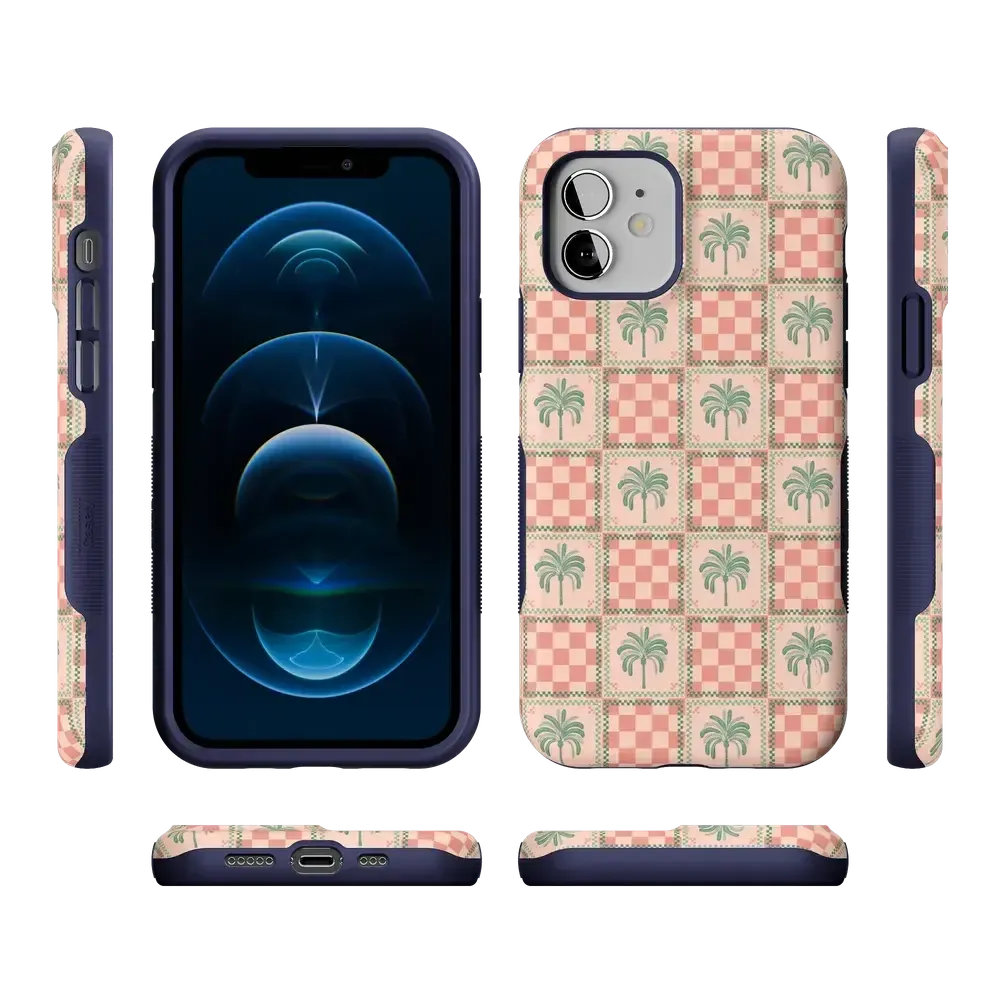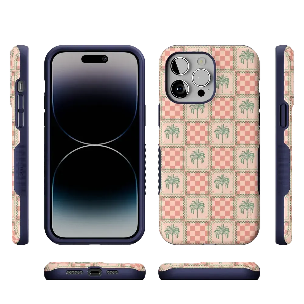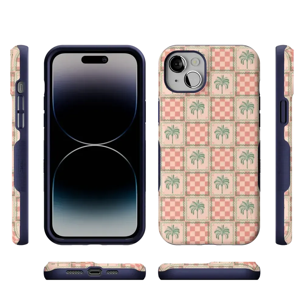 The Social Club Case is the ultimate throwback to retro resort days—think checkered pool towels, striped umbrellas, and that perfect shade of pink haze at golden hour. With a repeating grid of soft peach checks and tiny mint green palm trees, this playful design brings a nostalgic, vacation-all-the-time feel to your everyday. It’s a little vintage, a little preppy, and 100% summer-ready.