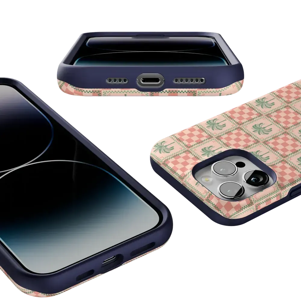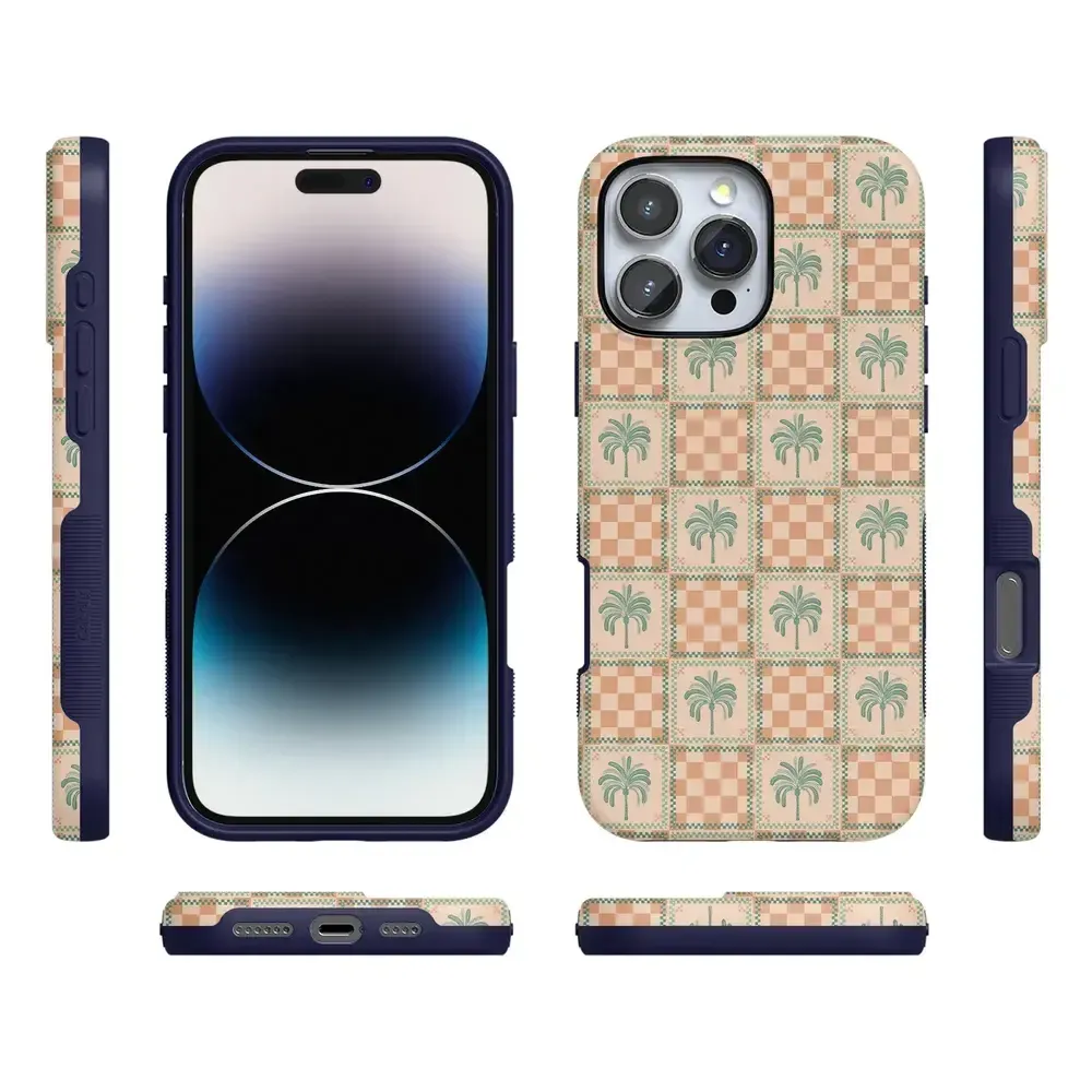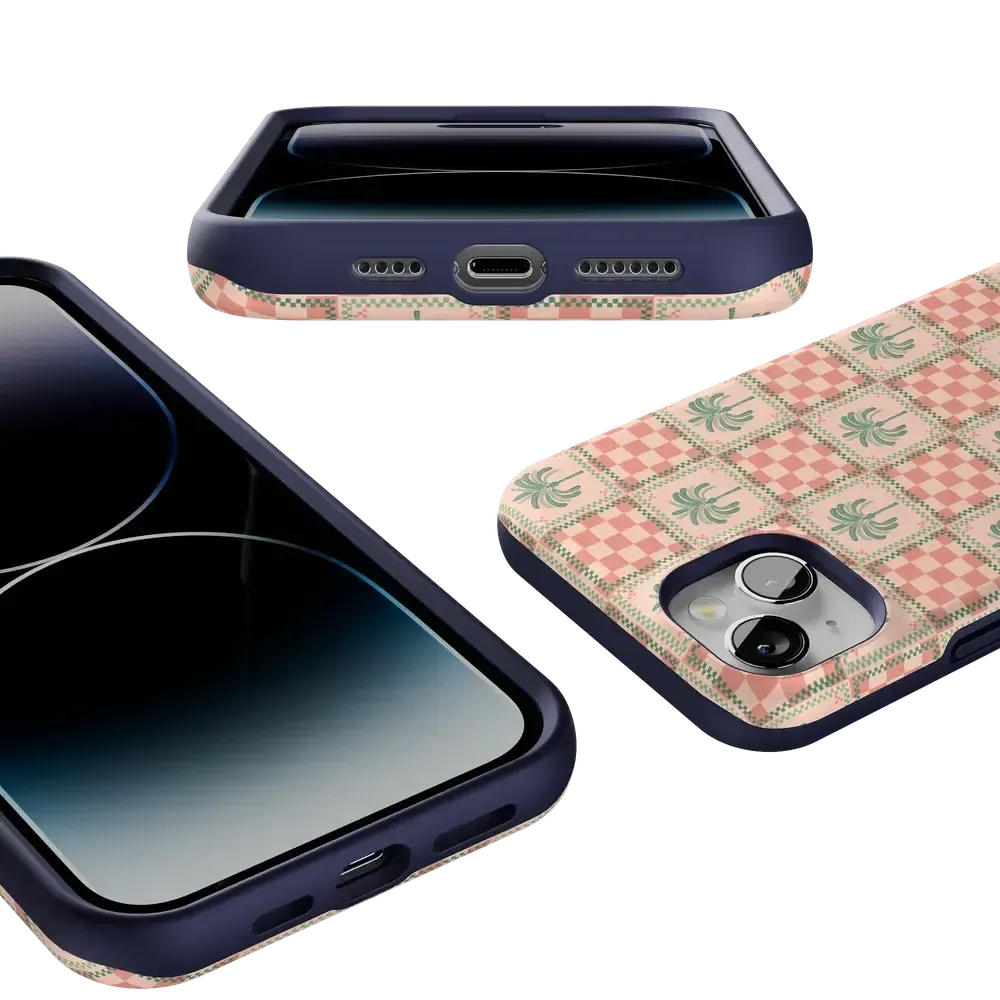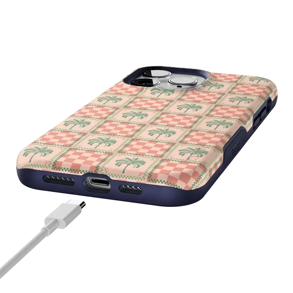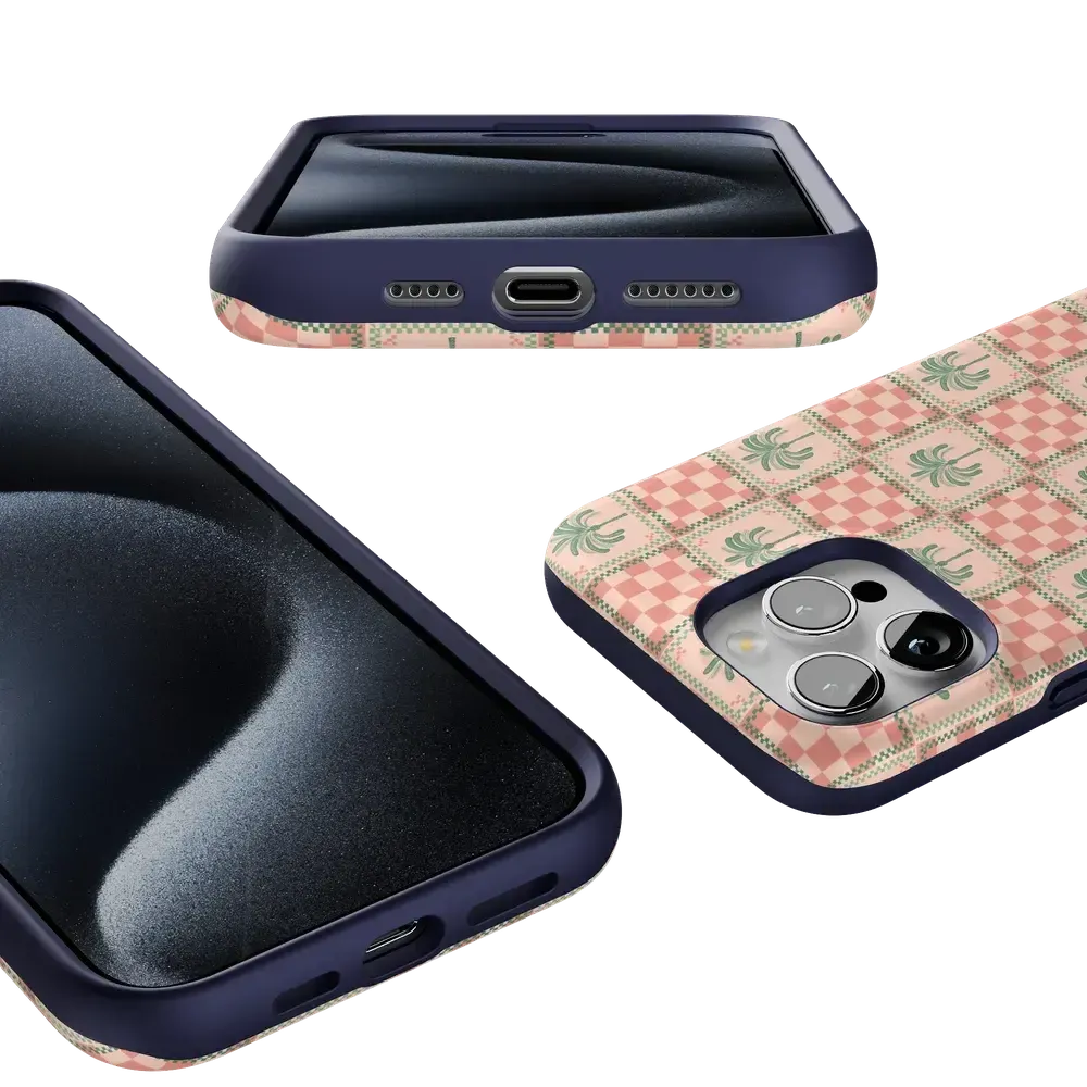 The Social Club Case is the ultimate throwback to retro resort days—think checkered pool towels, striped umbrellas, and that perfect shade of pink haze at golden hour. With a repeating grid of soft peach checks and tiny mint green palm trees, this playful design brings a nostalgic, vacation-all-the-time feel to your everyday. It’s a little vintage, a little preppy, and 100% summer-ready.
