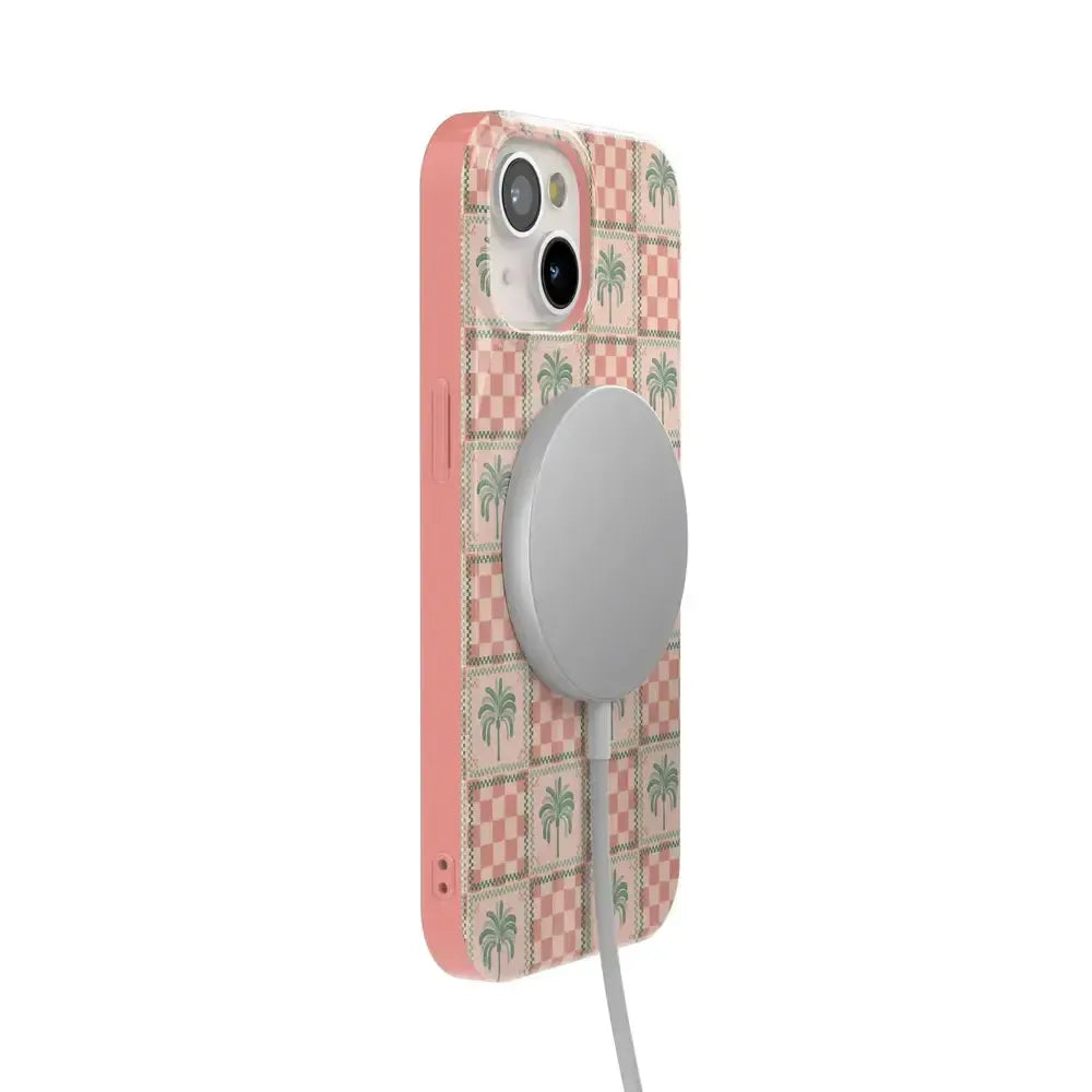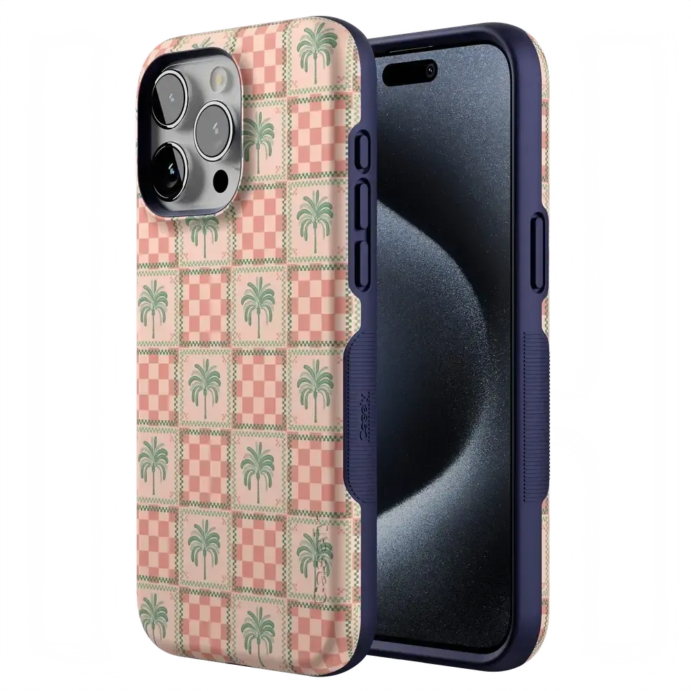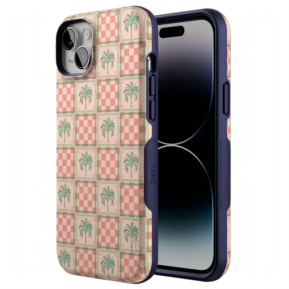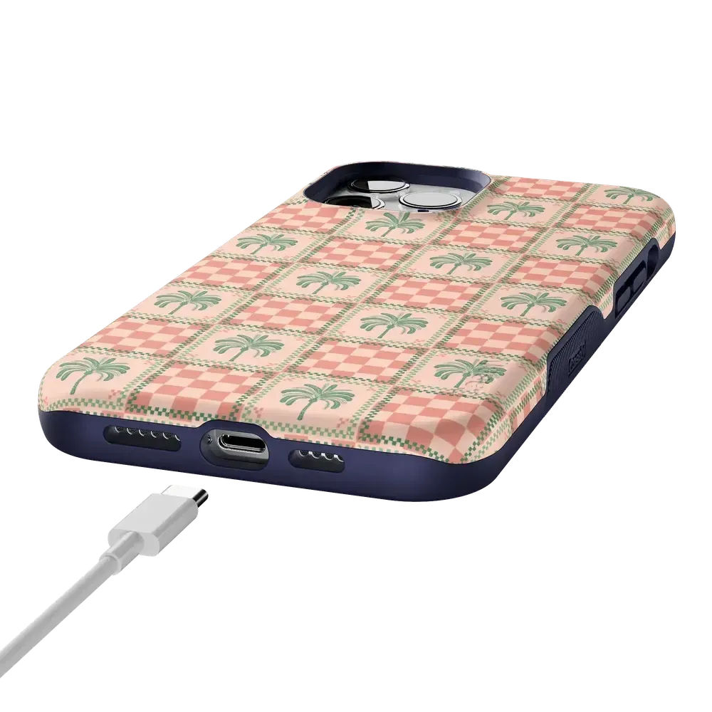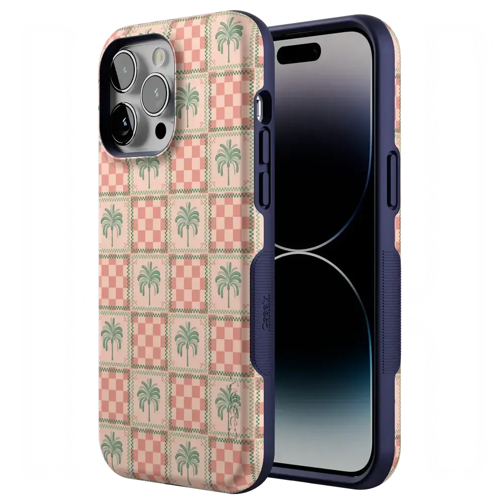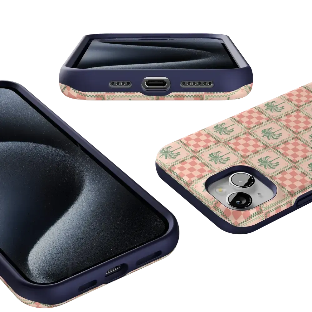 The Social Club Case is the ultimate throwback to retro resort days—think checkered pool towels, striped umbrellas, and that perfect shade of pink haze at golden hour. With a repeating grid of soft peach checks and tiny mint green palm trees, this playful design brings a nostalgic, vacation-all-the-time feel to your everyday. It’s a little vintage, a little preppy, and 100% summer-ready.