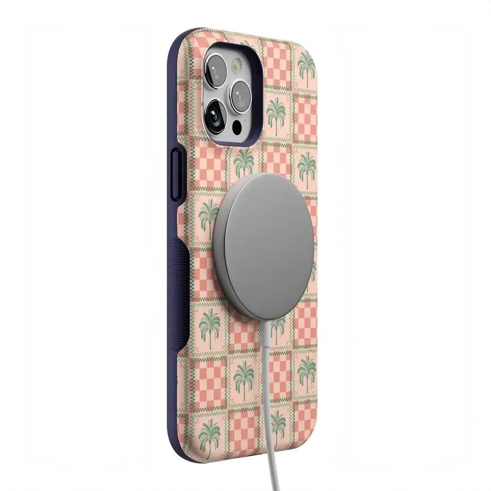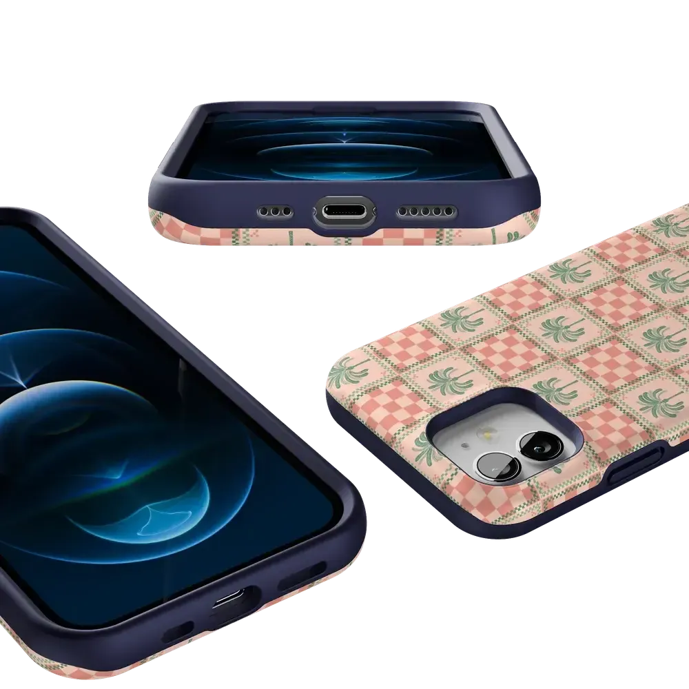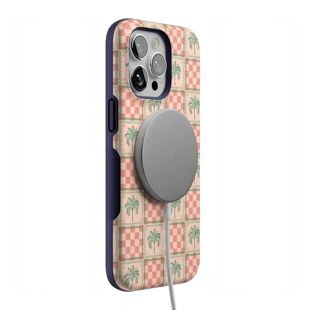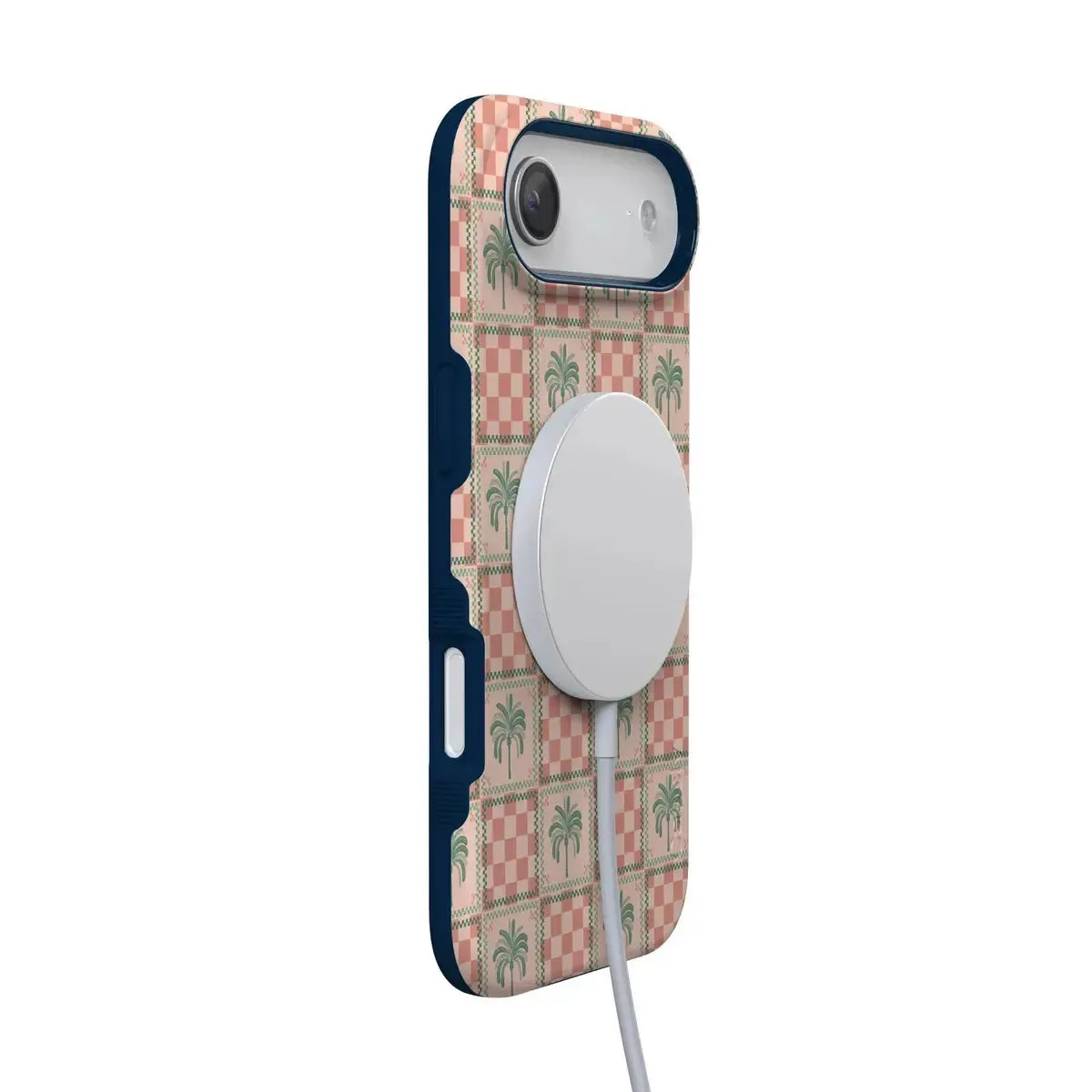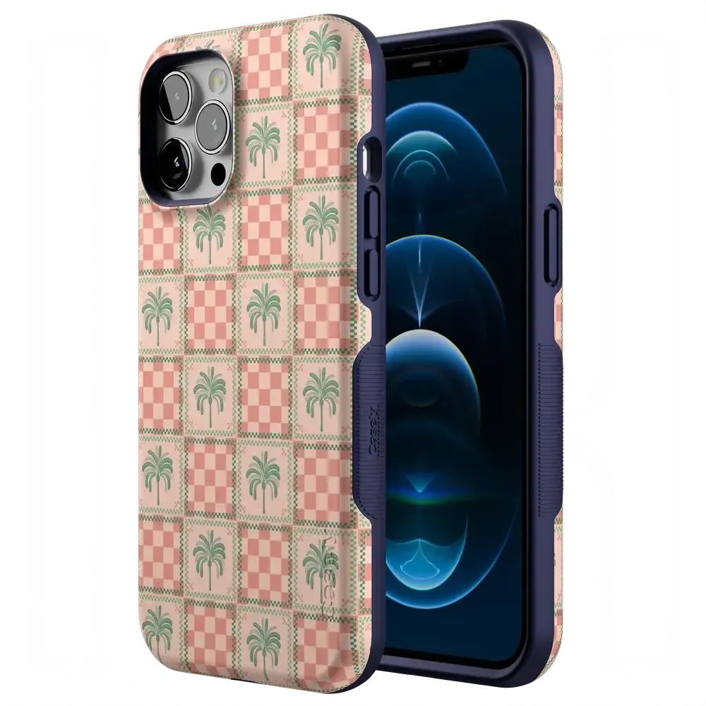 The Social Club Case is the ultimate throwback to retro resort days—think checkered pool towels, striped umbrellas, and that perfect shade of pink haze at golden hour. With a repeating grid of soft peach checks and tiny mint green palm trees, this playful design brings a nostalgic, vacation-all-the-time feel to your everyday. It’s a little vintage, a little preppy, and 100% summer-ready.