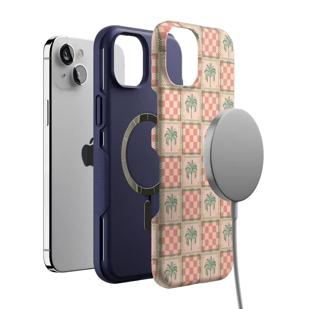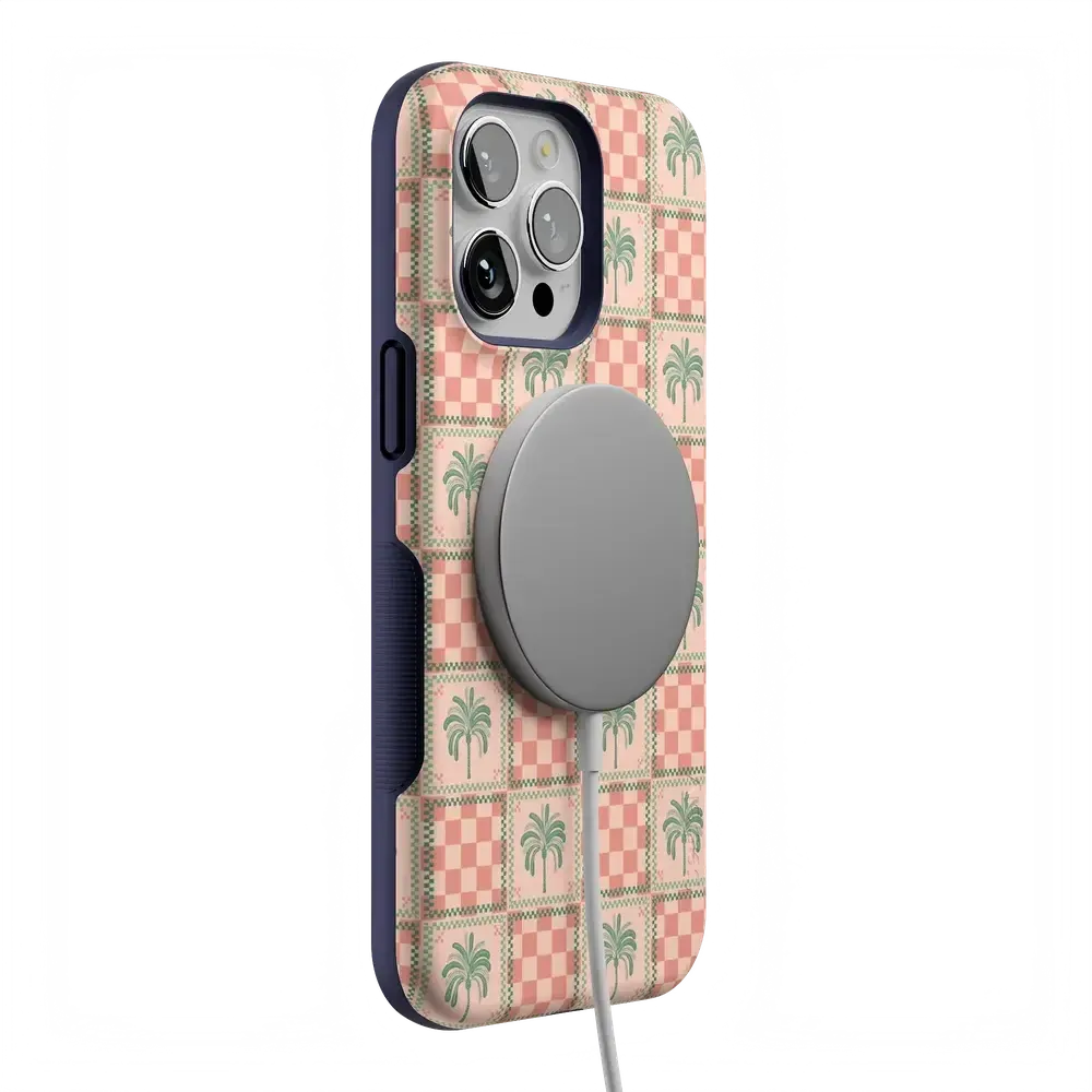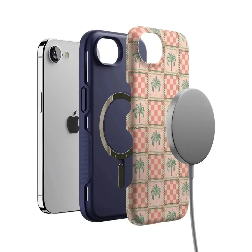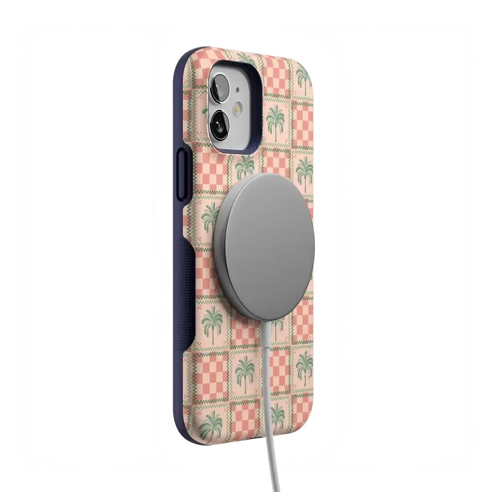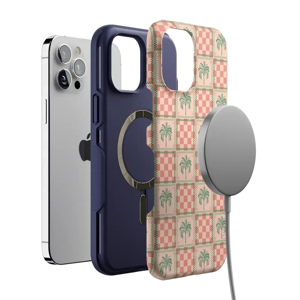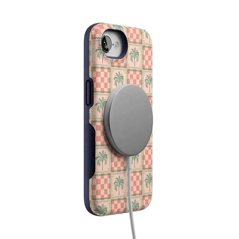 The Social Club Case is the ultimate throwback to retro resort days—think checkered pool towels, striped umbrellas, and that perfect shade of pink haze at golden hour. With a repeating grid of soft peach checks and tiny mint green palm trees, this playful design brings a nostalgic, vacation-all-the-time feel to your everyday. It’s a little vintage, a little preppy, and 100% summer-ready.