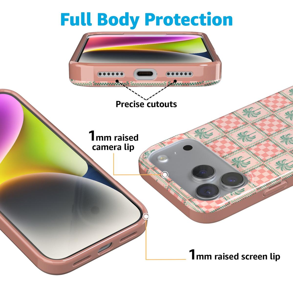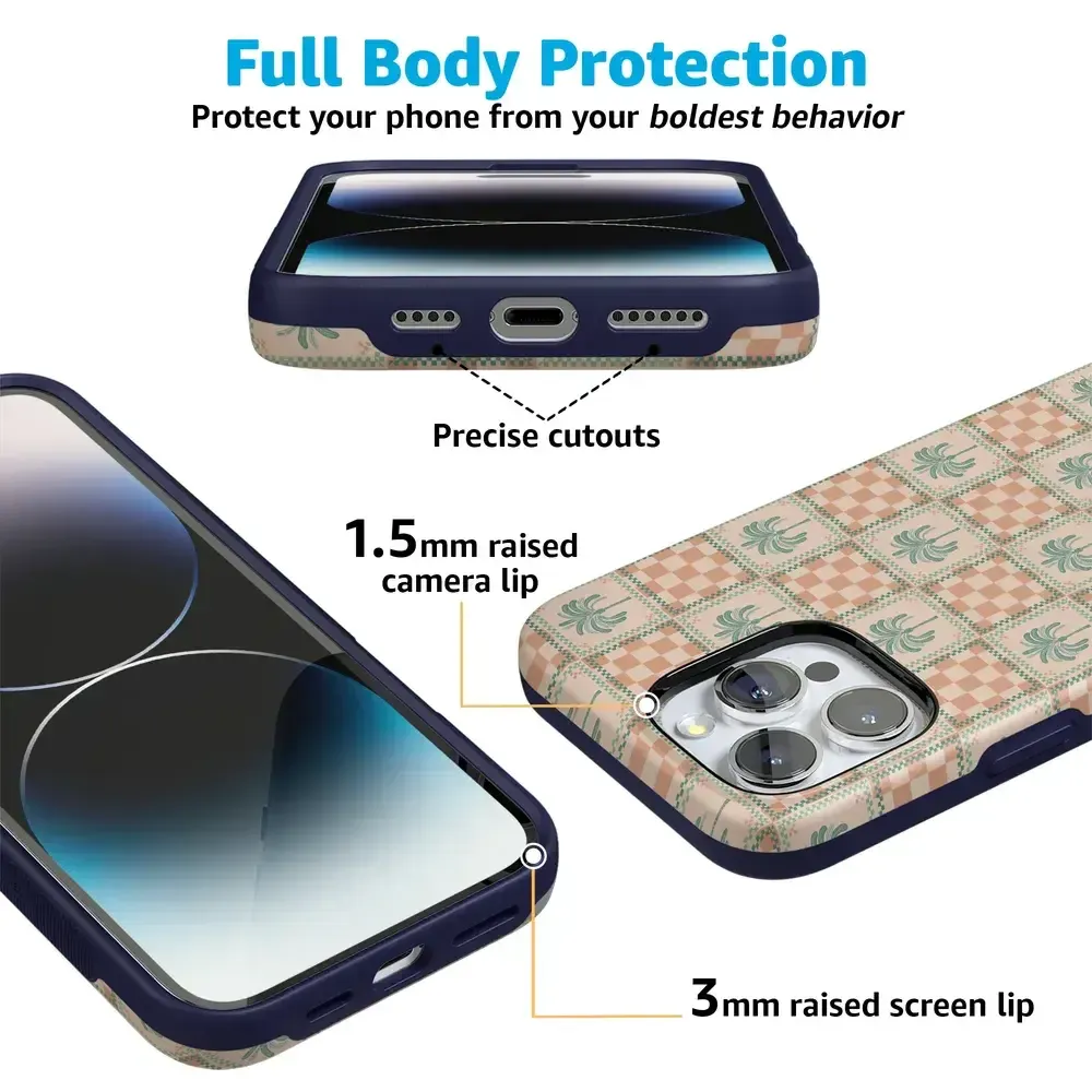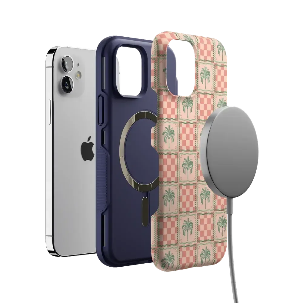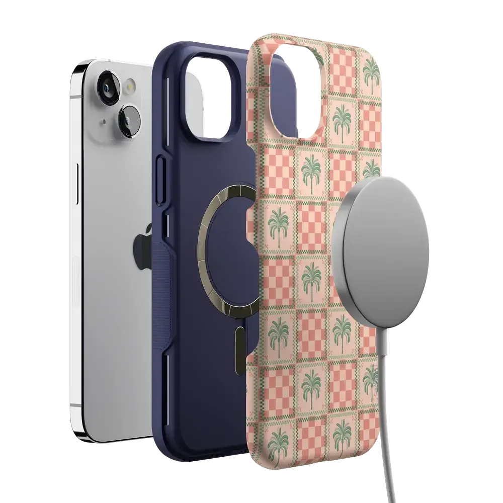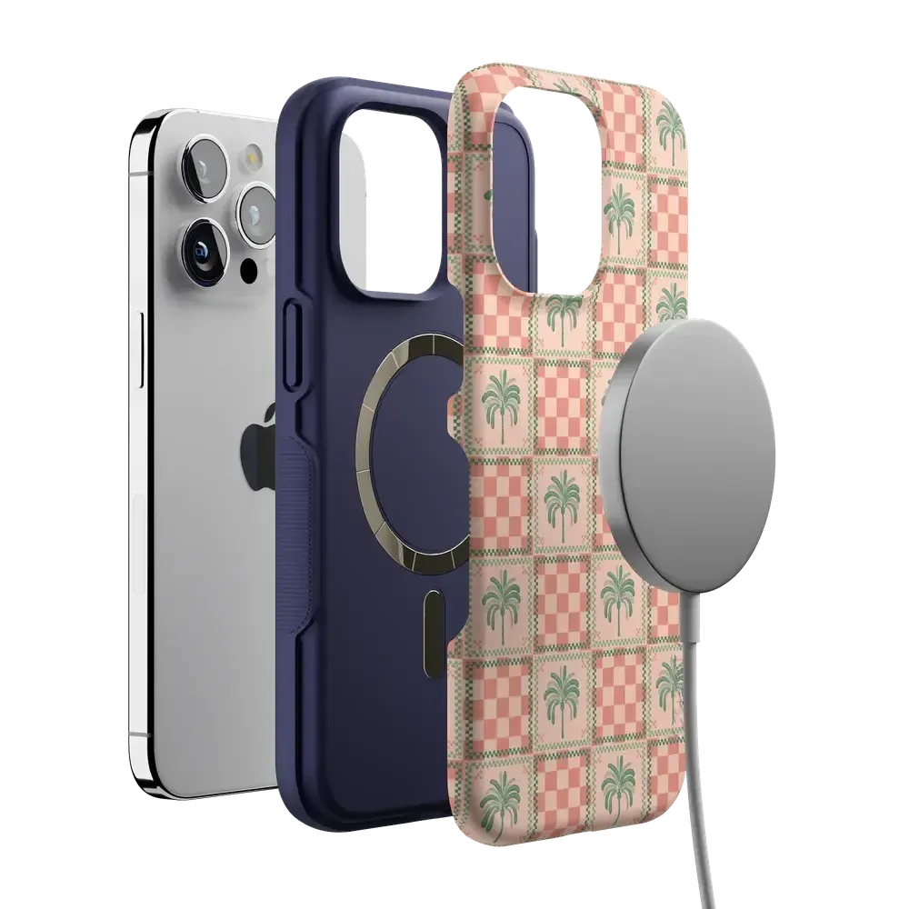 The Social Club Case is the ultimate throwback to retro resort days—think checkered pool towels, striped umbrellas, and that perfect shade of pink haze at golden hour. With a repeating grid of soft peach checks and tiny mint green palm trees, this playful design brings a nostalgic, vacation-all-the-time feel to your everyday. It’s a little vintage, a little preppy, and 100% summer-ready.