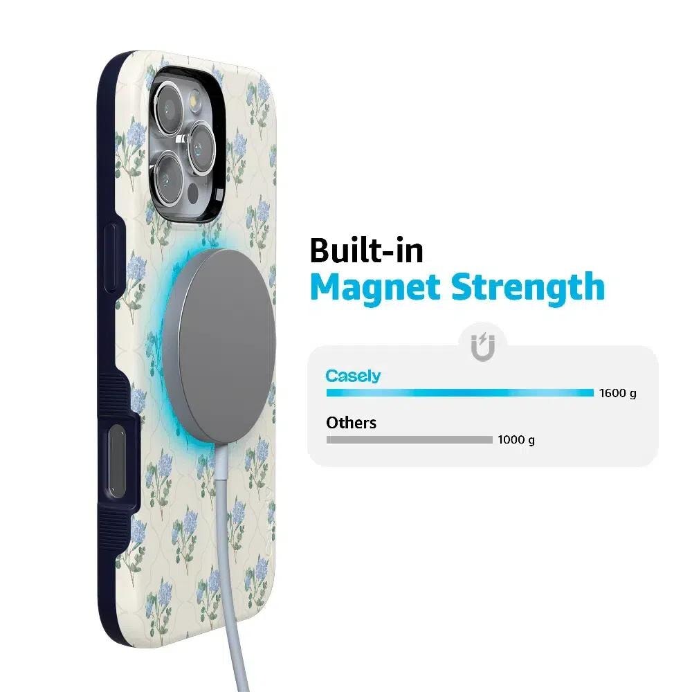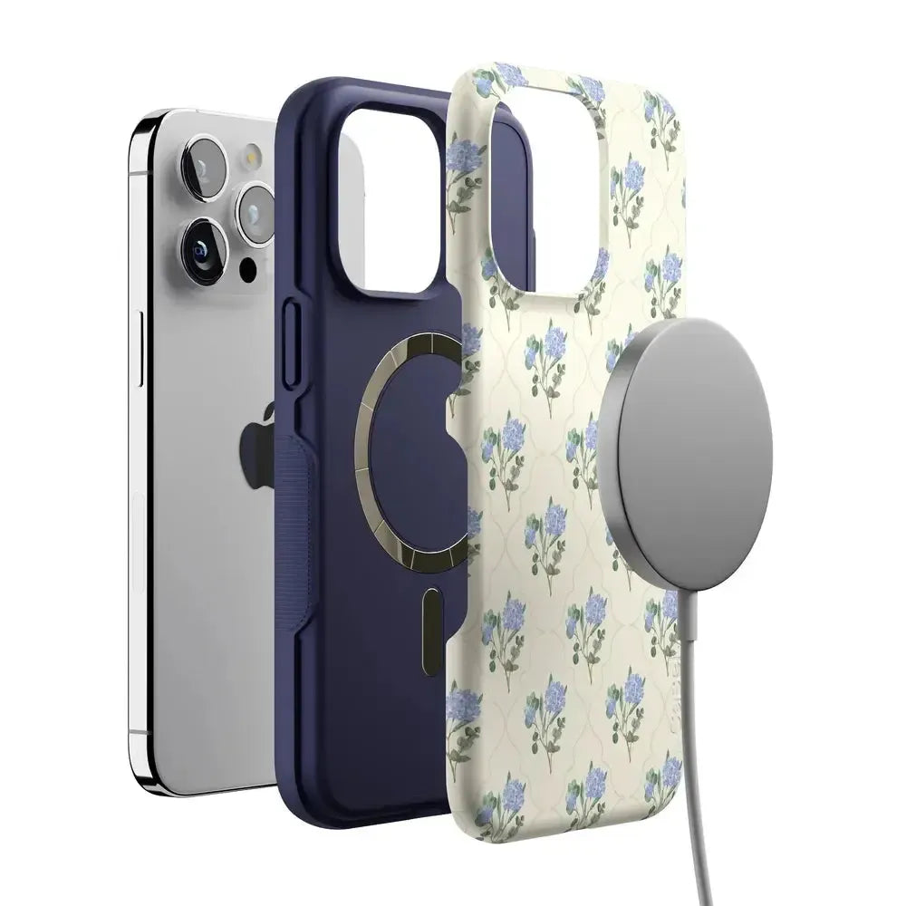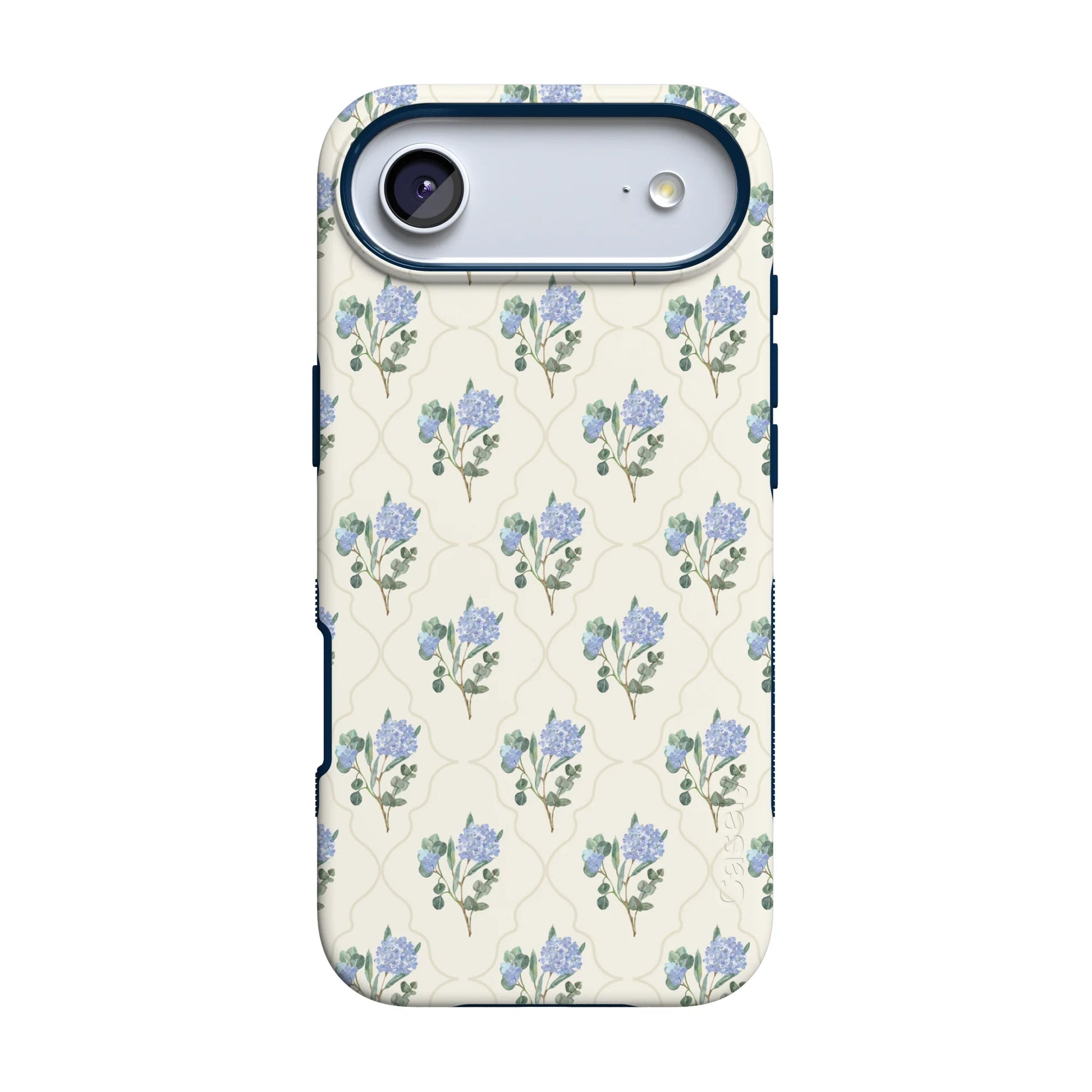 Bring timeless charm to your phone with the Vintage Garden | Blue Hydrangea Case. Delicate blue hydrangeas bloom across a soft cream background in a classic, wallpaper-inspired pattern. Designed with both style and durability in mind, this case is made with Bold protection and MagSafe® compatibility for effortless charging. Whether you're a floral fan or vintage aesthetic lover, this case adds a graceful touch to your everyday carry.