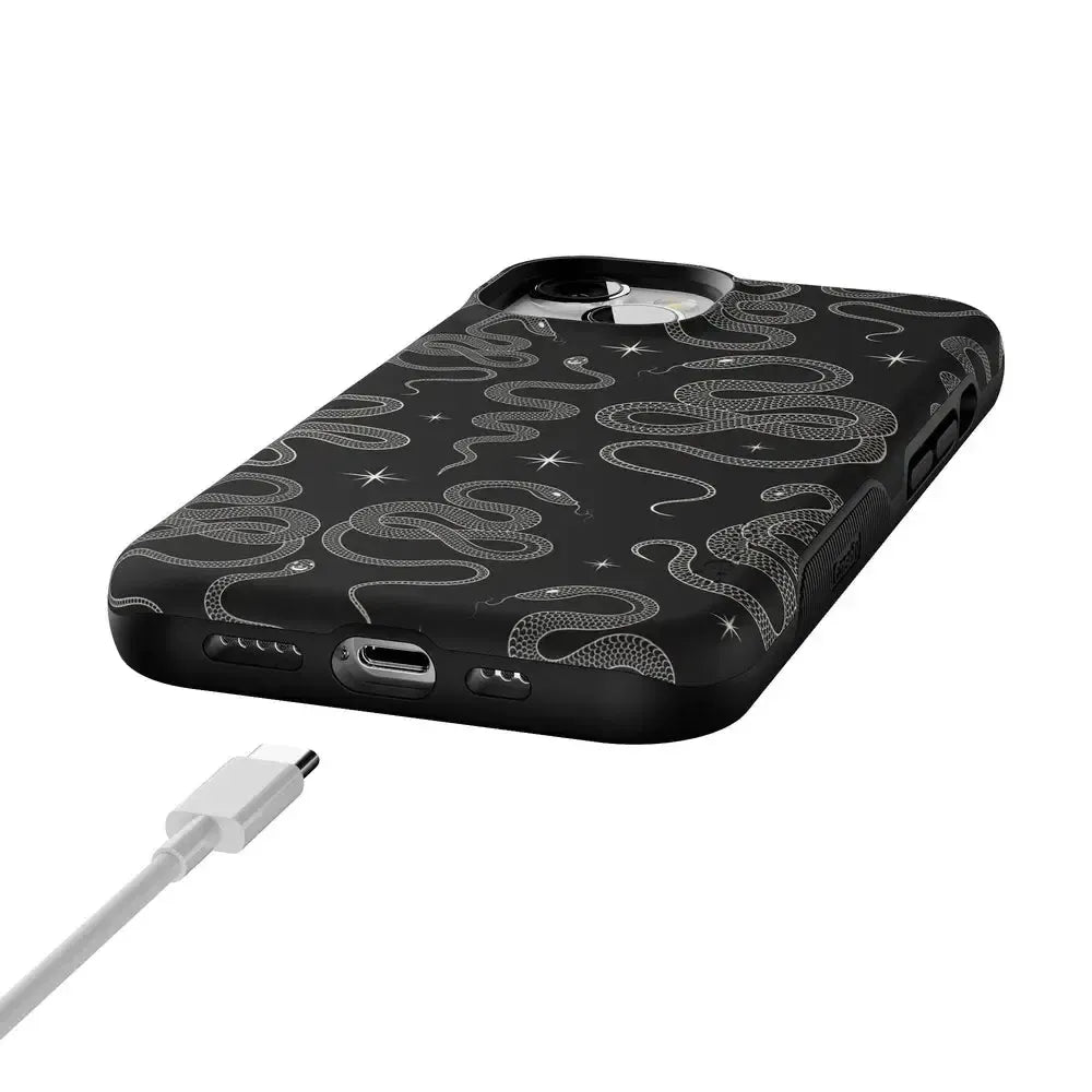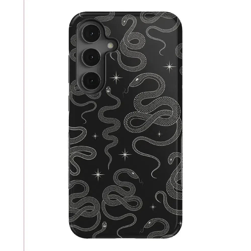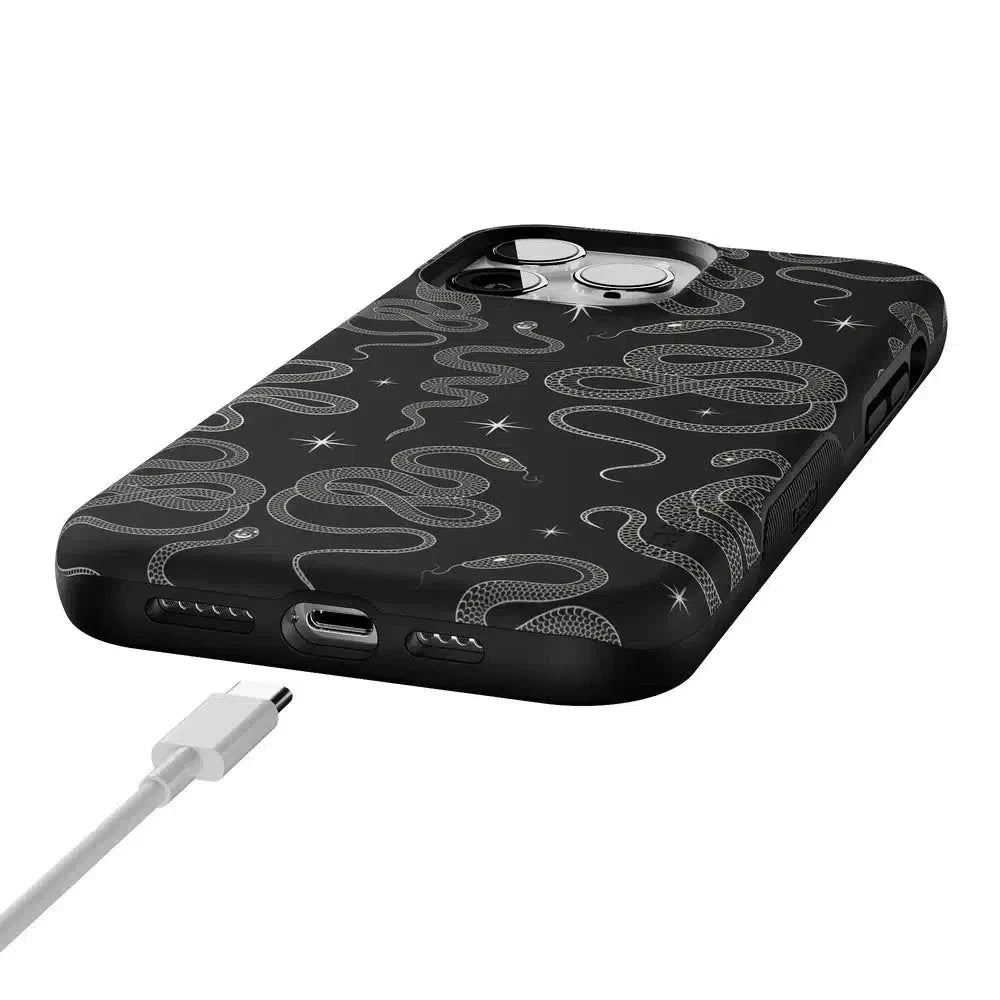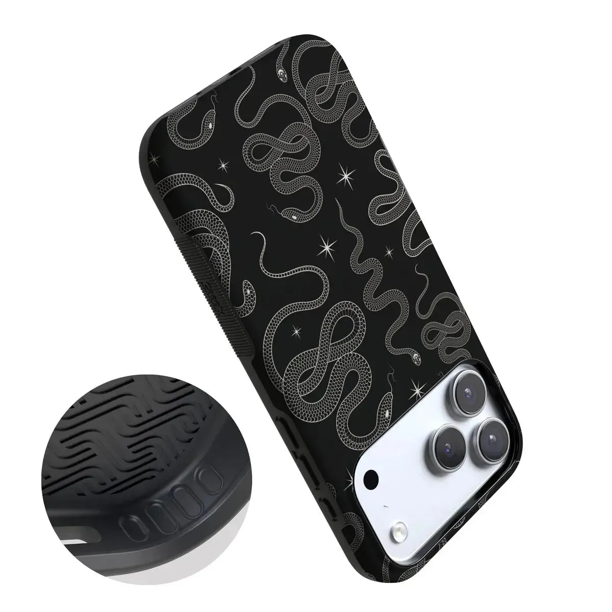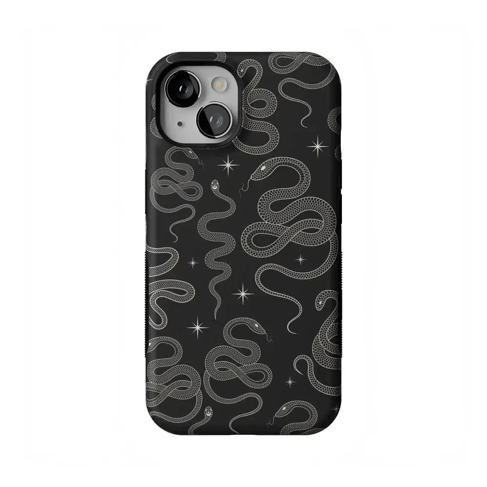 Channel your inner rebel with the We're Ready For It Black Serpent Case. This sleek, black case features an intricate serpent design that twists and turns across the back, adding a touch of mystique to your everyday style. The shimmering serpents against the matte black background create a powerful, yet understated look that's perfect for those who are no strangers to reinvention.
