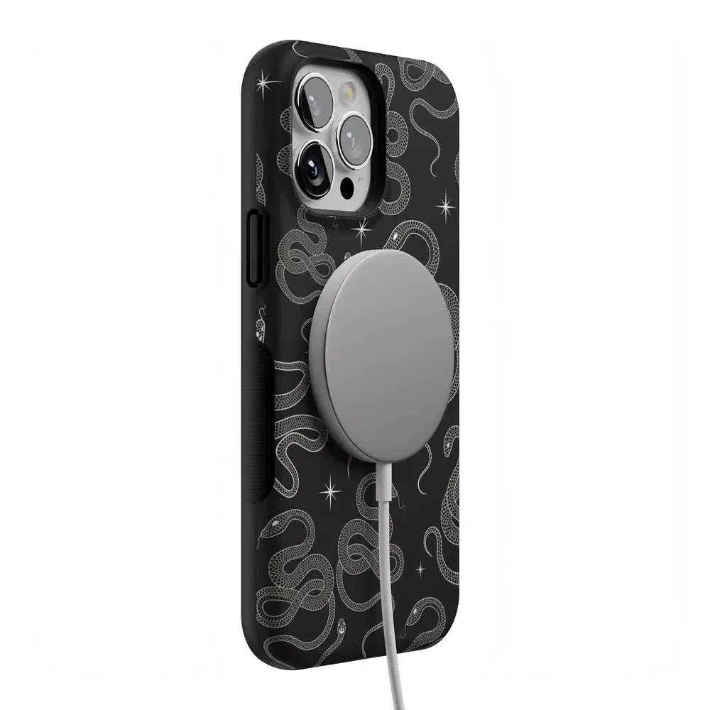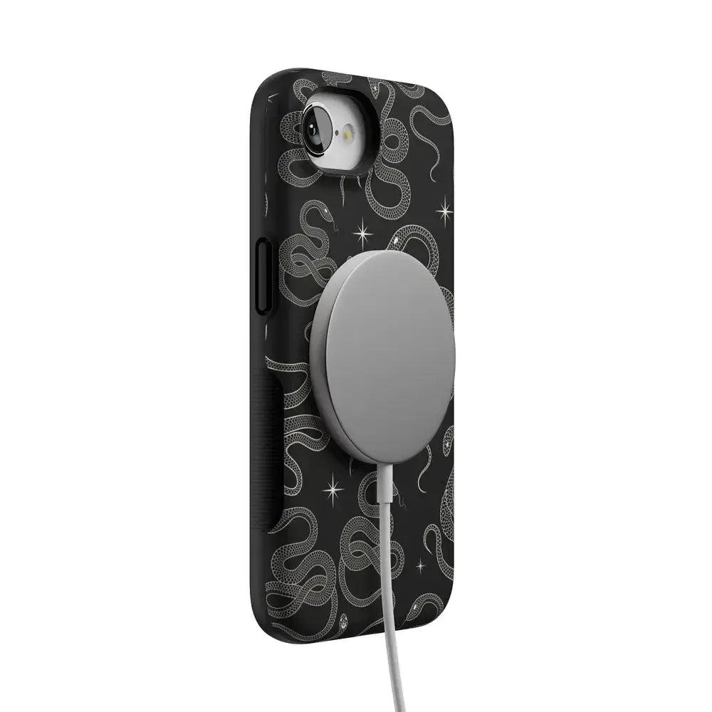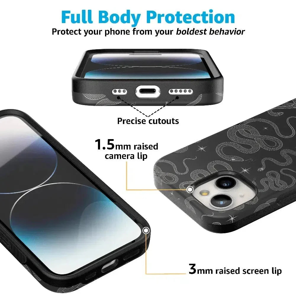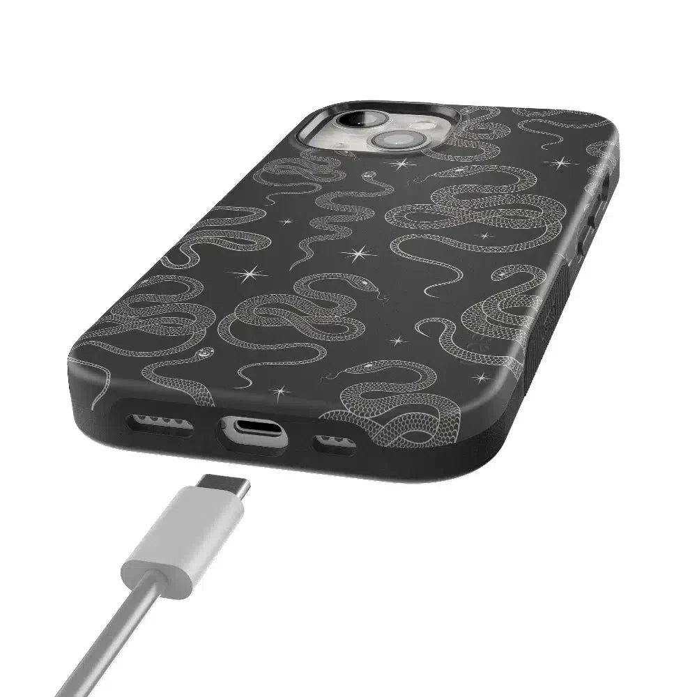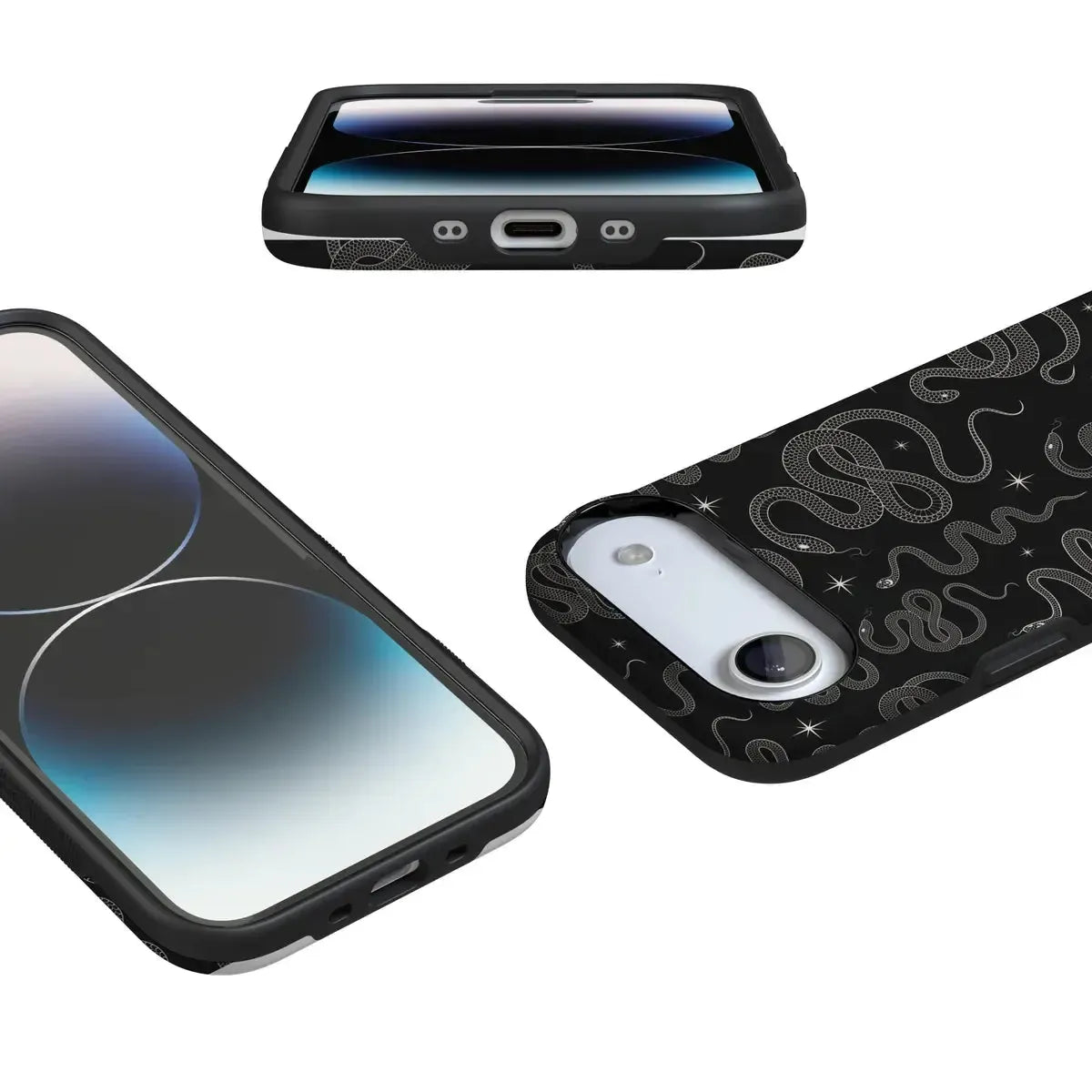 Channel your inner rebel with the We're Ready For It Black Serpent Case. This sleek, black case features an intricate serpent design that twists and turns across the back, adding a touch of mystique to your everyday style. The shimmering serpents against the matte black background create a powerful, yet understated look that's perfect for those who are no strangers to reinvention.